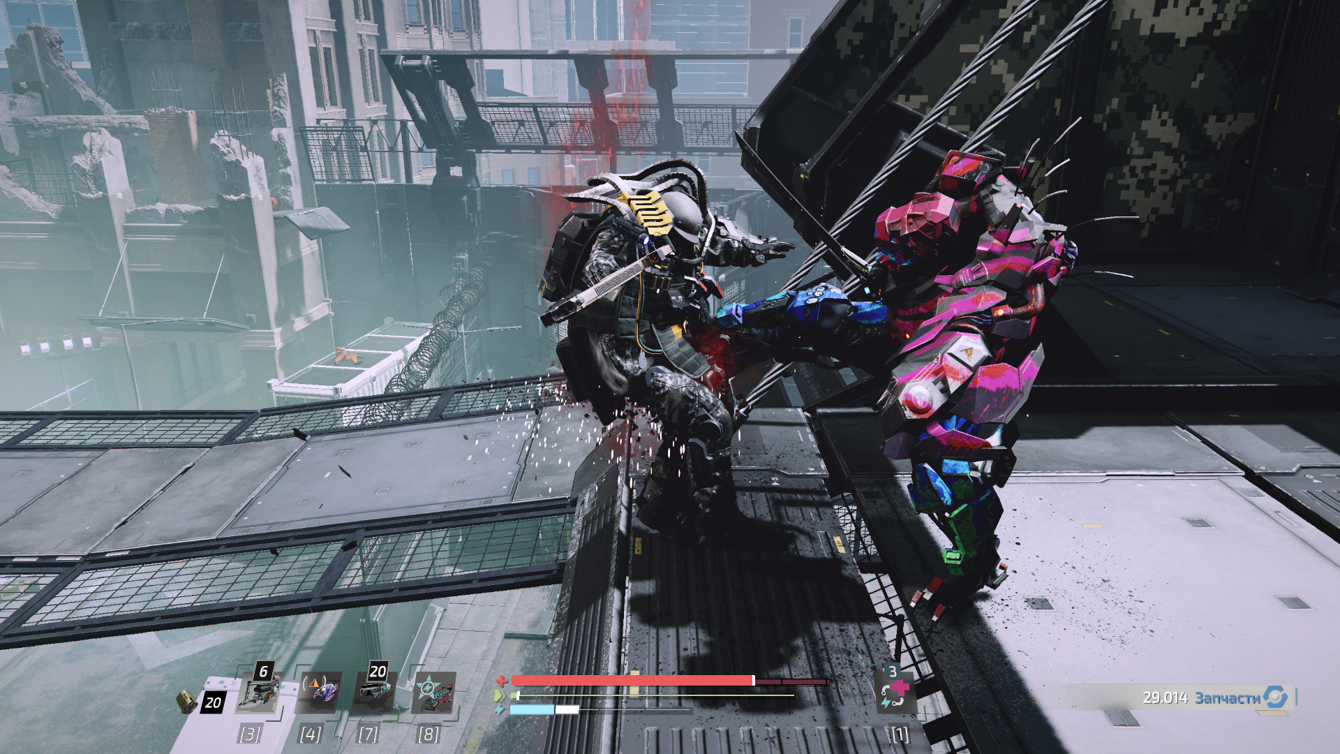 В игре миллион одинаковых мест. И я сейчас не про дизайн, который дает примерно два биома на всю игру с их вариациями. Основная проблема - набор задач. Есть зиплайн-секции смежные с бегом по стенам, есть арены обычные, есть арены, где стоят выдвигающиеся столбы, которым нужно выстрелить в "глаз", потому как этот всевидящий глаз наносит урон по ГГ просто наблюдая за ней, а после попадания начинается отсчет до восстановления глаза. Ну и просто секции, где нужно без боя от этих глаз уворачиваться и прыгать.