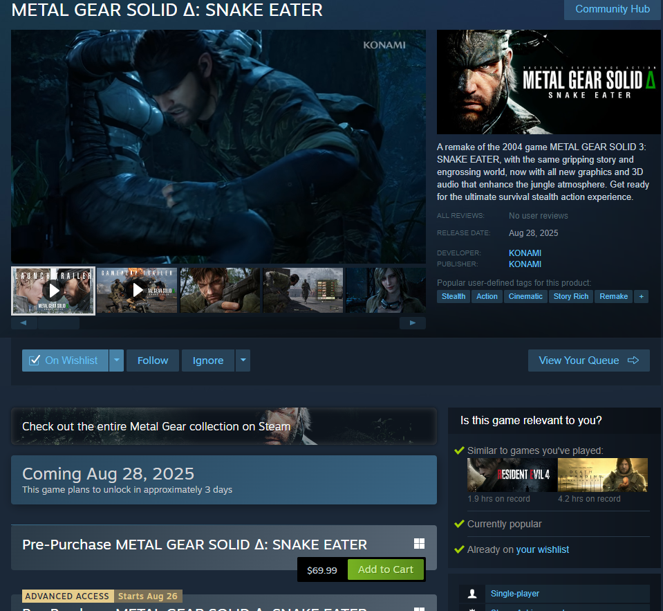 Вот для меня самое удивительное, что множество людей ноет что игра стоит 80ойро у них в регионе в стиме. Сука они даже оригинальный диск в жизни не видели, и эта вероятно их первая покупка игры мгс3. А в учет они не принимают что этот ремастер является абсолютно нишевым продуктом, который купят максимум человек 500 000 и то с божьей помощью например, ремастер ре4 продался в общей сложности в 10 млн копий - несоотносимое количество. Половина игры состоит из катсцен, которые нужно анимировать, менять сам геймплей. Я удивлюсь если ремастер вообще окупится