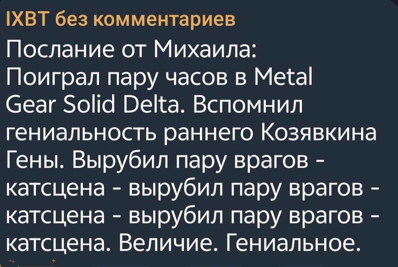 Прошёл всю игру, так и не понял откуда ворчание на фпс. Ни разу не чувствовал ПРОСАДОК, а самое главное СТАТТЕРОВ, которыми известен УЕ5. Даже мыльца всякого было минимум, при том что я амдшник с ФСР. Конами смогли сделать заебись, не проебали всё хорошее что было у оригинала.