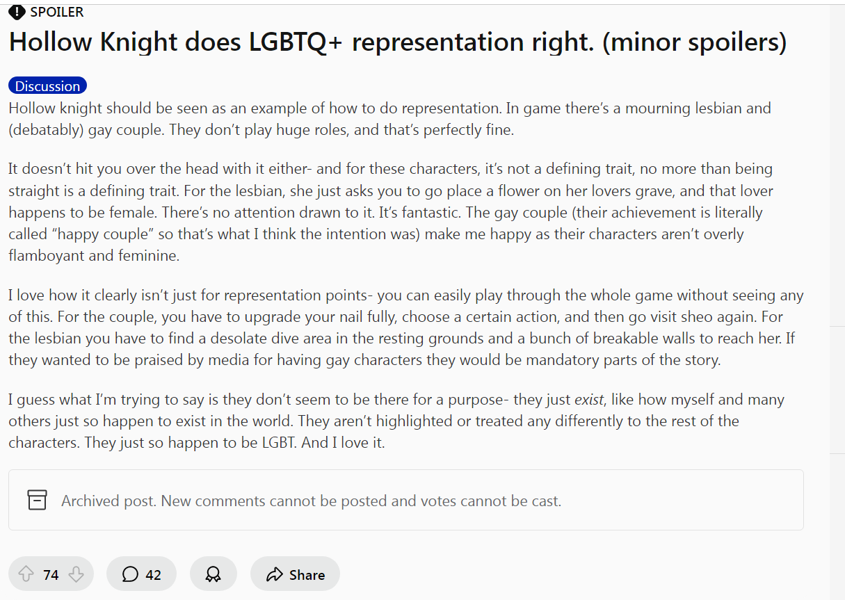 В недавно вышедший Silksong, от которого в восторге 500к соевичков, тоже есть лесбухи, а именно главная героиня Хорнет.