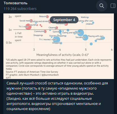 >>9794592 (OP) > Самый лучший способ остаться одиноким, особенно для мужчин (попасть в ту самую «эпидемию мужского одиночества») – это активно играть в видеоигры. А альтернатива это видрилы.