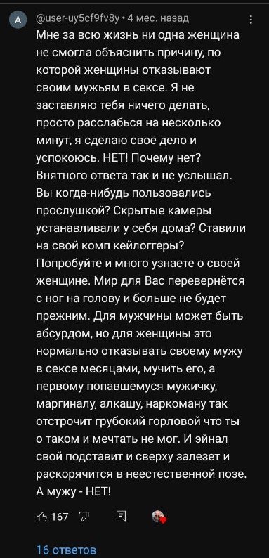 А ещё ты меня принял за двух разных людей, лол. Я кун, если чё. Просто надо быть честным с собой. Если бы вам не нужны были женщины, вы бы их не ненавидели. Вы эмоционально инвестированы в них, так или иначе. И ещё пытаетесь себя же в чём-то убеждать, что у всех какие-то хобби и прочая хуйня. У меня вот есть хобби и прочая хуйня. И это никак не влияет на мою личную жизнь