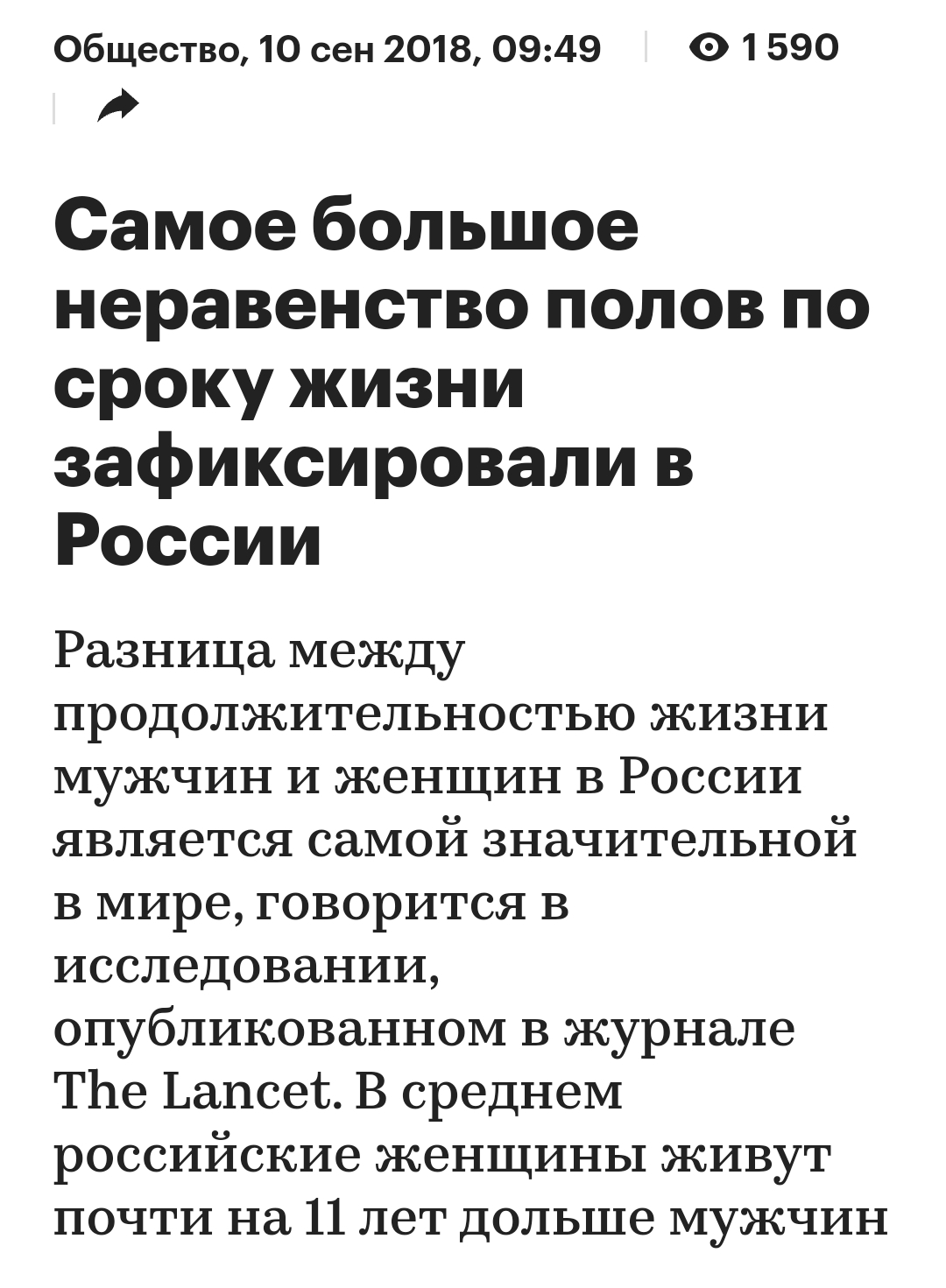 В России мужчины подыхают в среднем на 11(!) лет раньше женщин. Большинство даже до пенсии не доживают. И это инфа в доесвэошные времена. Сейчас там разница уже минимум лет 15-20 нахуй. А у вас всё женщин ущемляет поцреорхат.