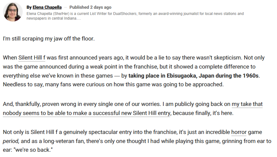 Вы просто не понял, вы уже не основная аудитория. Вот для кого этот высер делали и оно вполне всем довольно Я до сих пор соскребаю челюсть с пола. Когда Silent Hill f был впервые анонсирован много лет назад, было бы ложью сказать, что скептицизма не было. Мало того, что игра была анонсирована в самый слабый момент франшизы, она показала полную разницу со всем остальным, что мы знали в этих играх — действие происходит в Эбисугаоке, Япония в 1960-х годах. Излишне говорить, что многим фанатам было любопытно, как будут подходить к этой игре. И, к счастью, оказались неправы во всех наших заботах. Я публично отказываюсь от своего мнения о том, что никто, похоже, не может сделать успешную новую игру в Silent Hill, потому что наконец-то она здесь. Мало того, что Silent Hill — это действительно захватывающее вступление во франшизу, это просто невероятный период игр ужасов, и как у давнего фаната, у меня была только одна мысль, когда я играла в эту игру, ухмыляясь от уха до уха: «Мы так вернулись». И не волнуйтесь, в этом обзоре не будет спойлеров.