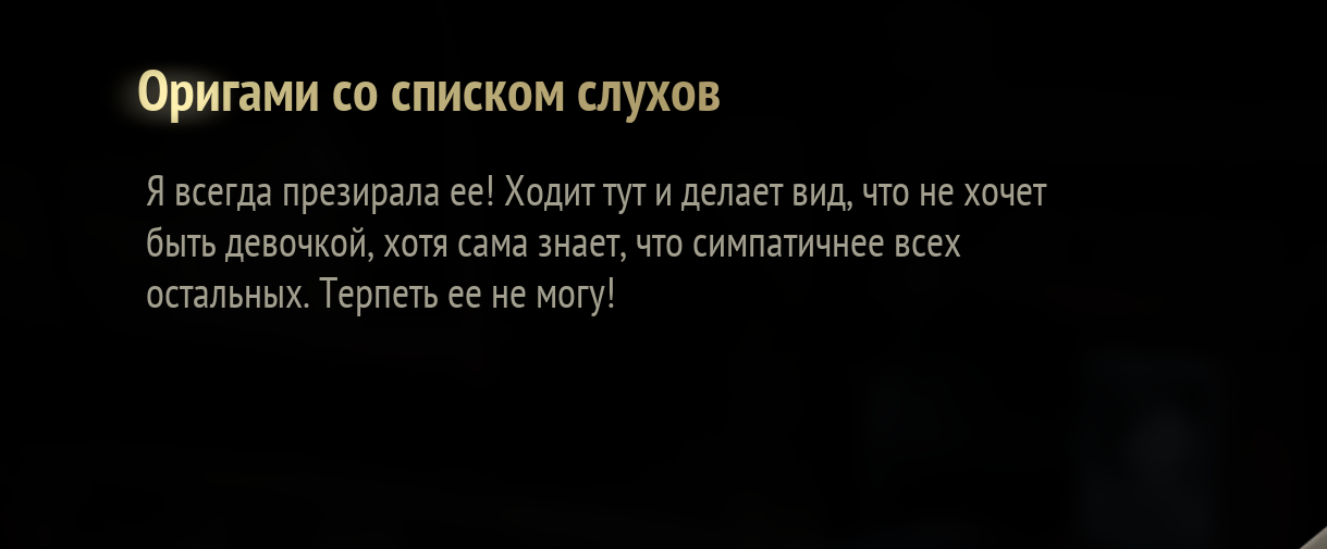Когда в оригинальных играх искали лор и скрытые смыслы, то обращали внимание на текстуры, модели, на двусмысленные анимации. Что было ключевым фактором, именно эта двусмысленность, когда между ебучей реальностью и кошмаром сложно провести однозначную грань. В Ф нам персонажи орут манифесты, как в Наруто, чтобы до самых даунов все дошло,