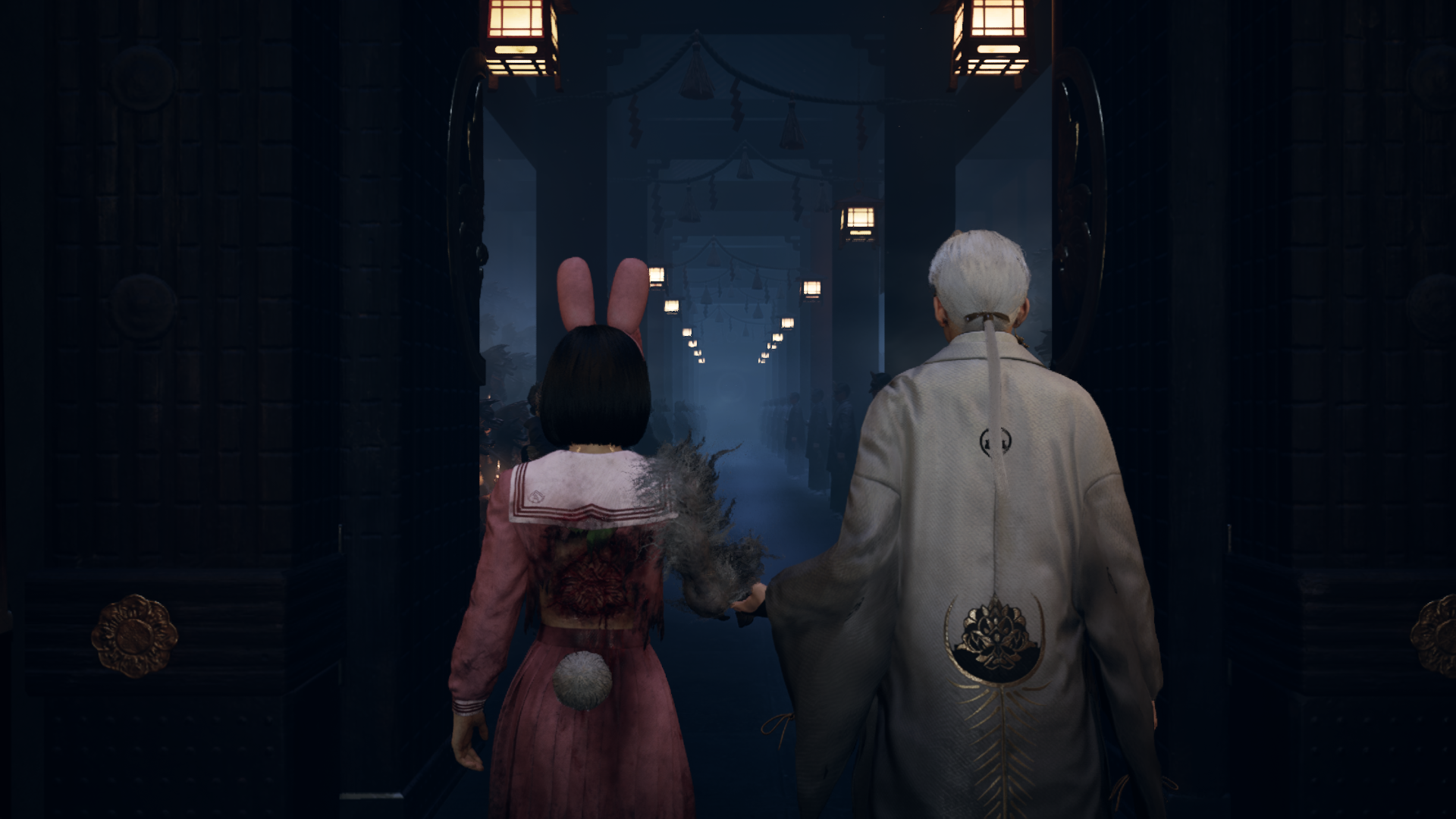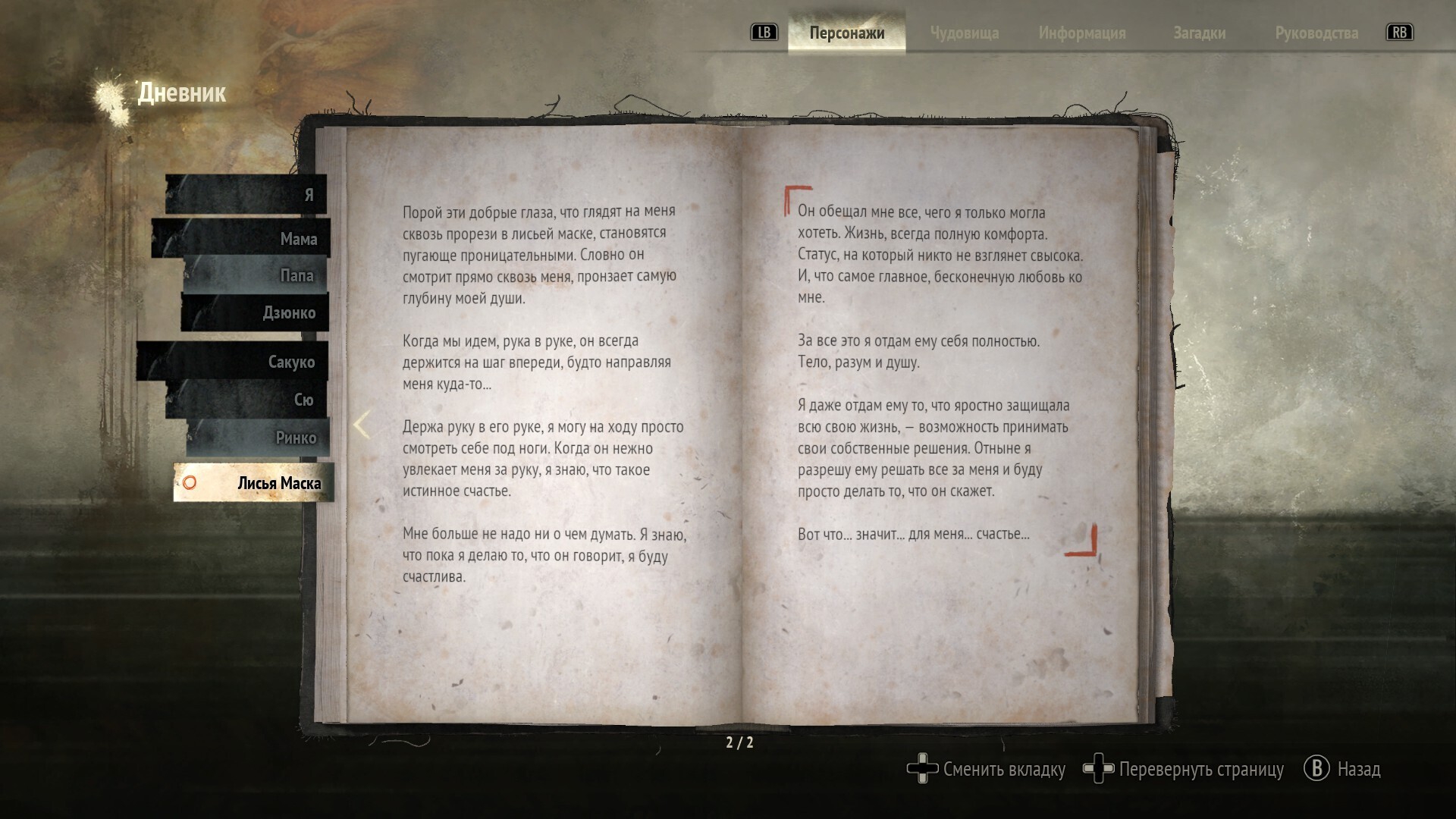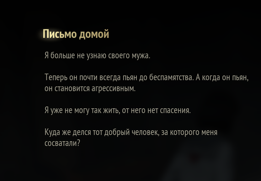 >>9810511 Насколько я понял, гг вероятнее всего на свадьбе находится своей на момент начала сюжета, батя продал её в брак по расчету, чтоб долги покрыть. Когда она перемещается в реальность духов и видит челика в маске, то она на самом деле возвращается в реальность. Собственно, отсюда и все сообщения от куклы, записи в дневнике мол во мне борются девочка и женщина, записка про отца который рассчитался с долгами, сестра предательница, монстр в платье невесты и т.д. А потом гг под таблетками всех вырезает на свадьбе. Есть конечно ещё вопросы, надо игру все ж перепройти ещё разок.