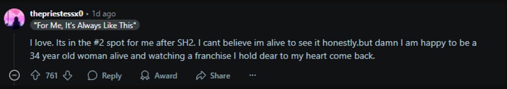 Одна моя претензия такая же, как была к СХ2мейку (хомяк тупо не помню, остальное новое не играл): Бесшовный мир, где двери/калитки/дырки это не порталы в очередную комнату, а просто отверстия в которые ты можешь входить и выходить как заблагорассудится, всё напряжение от боёв с монстрами теряется, т.к. ты можешь тупо отступать и отступать пока не выведешь очередную бабайку в удобное место (ну и отлечиться можно, и зелёную шкалу восстановить и всё на свете сделать). Тбх так было и в 1-2-3, в сегментах где слоняешься по городу, хотя в первой части это решалось тем что по улицам бродят собаки-птеродактили-обезьяны, у которых с мобильностью всё не совсем хуёво (всё равно можно обычно обойти, но хотя бы что-то).
