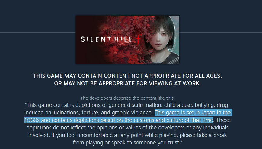 Такой комплект НИ ПРИ КАКИХ УСЛОВИЯХ не мог бы пройти цензуру любой повесточной конторы вроде свитбеби, это просто невозможно по определению. А самое смешное, что тебя, буквально с порога, встречает дисклеймер, очень похожий дисклеймер можно встретить знаешь где? В современных переизданиях американских мультиков 60-80х, потому что в них, внезапно, негров высмеивают. Ну а дальше я тебя очень поверхностно расскажу про сюжет: сюжет повествует о школьнице, где примерно половину всей игры мы в реальном мире путешествуем с выжившими друзьями и узнаем, что друзья то из них хуевые, ибо гг к ним со всей душой, а они вокруг нее сплетни пускают, да подлянки мутят. Информация что у гг батя- алкаш и тиран, фигурирует в некоторых записках да и то, напрямую особо не говорится. И только к последним ~2 часам игры, когда мы попадаем в дом гг - одну из финальных локаций, мы можем наблюдать ситуацию в её доме. А ситуация там такая: батя разорился и задолжал нихуево денег, так же будучи ранее зажиточным японцем, он пытается продолжать делать вид что все заебись, что сильно давит ему на менталку, на фоне этого он начал сильно пить и срываться на семью. Мамка это все понимая, старается поддерживать мужа ни смотря ни на что, ибо как бы тяжело не было, есть тенденция к улучшению, ведь батя таки смог расплатиться с долгами. В то же время их дочь, будучи инфантильным ребенком в переходном возрасте - срывается на батю с истериками, достается и мамке ведь КАК ТЫ ЕВО ТЕРПИШ! Тем не менее батя продолжает держать себя в руках, а мамка старается сгладить ситуацию. На это накладывается тот факт, что гг крайне неприятна тема женитьбы, ведь по обычаям того времени жена, буквально, выписывается из своего рода и далее принадлежит к роду своего мужа, поэтому вышедшая замуж сестра, с которой гг была близка - "бросила" её. Отсюда в "реальном" мире все эти комментарии и записи в дневниках. В то же время, еще половина игры происходит в "темном храме", где ты же гг, но уже чуть более взрослая, приходит к осознанию своей неправоты и принятию, в конце концов убивая свою "инфантильную" версию и принимающая родителей. Так вот, если мы говорим о сюжете и посыле, то идея примерно такая, да, там еще долепили мистики и таблетки от шизы, но это на основную идею сильно не влияет. Где же тут повестка, мой неполноценный друг?