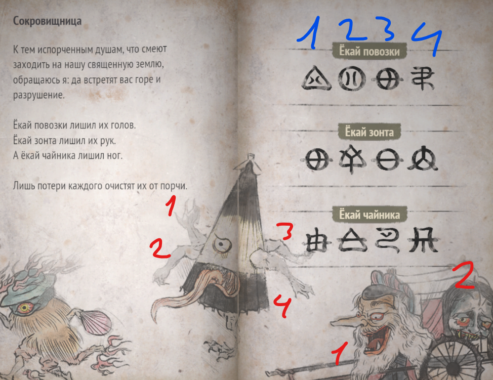 >>9822218 Слово "лишил" здесь неверное. Вводит в заблуждение ради стишка и истории. Важно именно общее количество правильного атрибута у данных героев стишка, и по количеству - подбираешь верный символ по порядку Причём даже нумерация шифра идёт слева направо. Может это в конкретных локализациях так, и на японском справа налево шифр идёт. Я хз.
