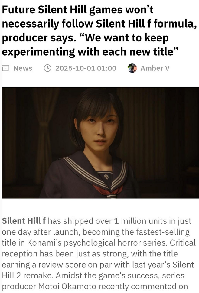 Да будет сиквел Фки, не ссыте. Это уже самая быстропродаваемая часть в серии. А до самой продаваемой всего чуть больше ляма еще. Но вряд ли она обгонит сх2 ремаке, расположится на втором месте. И это ебать какое достижение. Буквально сх без сх, с порваными жопами базовичков, дал пососать всем остальным играм в серии. Уверен конами уже подписывают новый контракт с необардами, о чем мы узнаем в начале 2026 на sh transmission