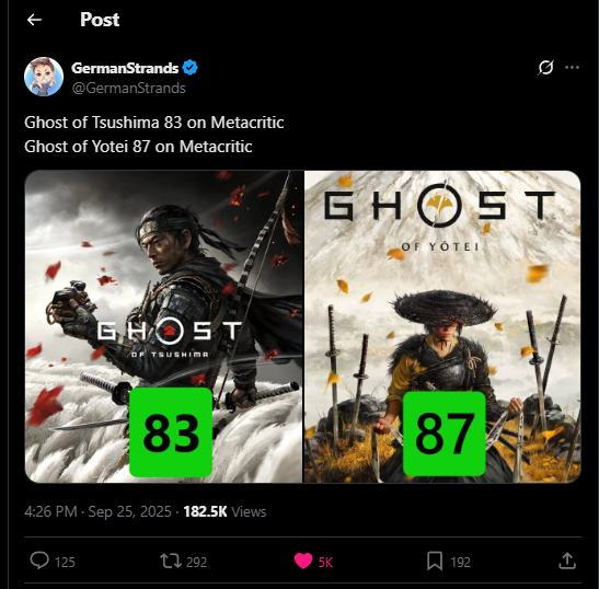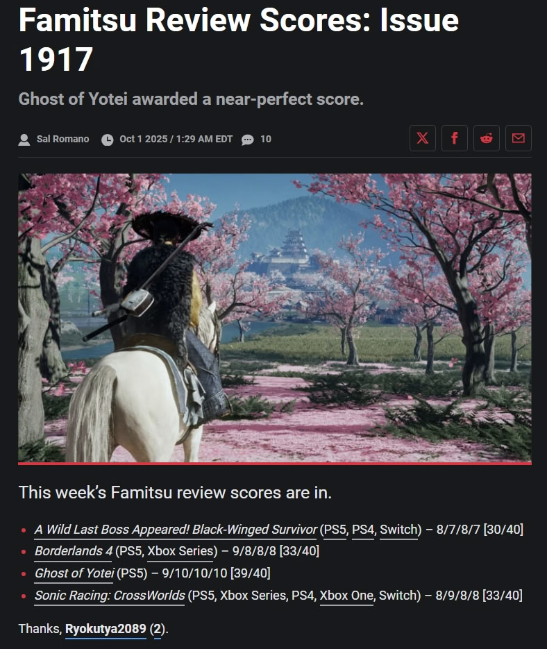 В новостях из первого мира от людей которые играют в игры, гигавинчик Ghost of Yotei (GoY) получает почти идеальную оценку от фамитсу, игра про японию от западной студии зашла японским критикам, напоминаю что цусима получила 40/40.