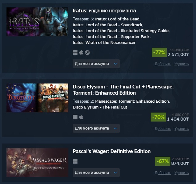 Зацените, что набрал. Иратус - потому это походу единственная игра про отыгрыш за некроманта. Побег с Планетки: Турнир - потому что Диско Элизиум очень зашёл, хочется навернуть подобного. Паскаль - потому что какой-то странный соулс-лайк, портированный с планшетов, а соулс-лайки и странности я люблю.