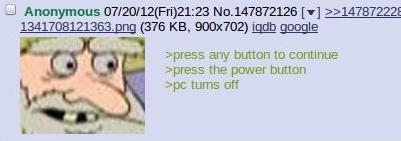 >>9797088 Сидят короче душеблядки в треде, готовятся к перекату. Вдруг, в одном посте пишут: - 17! Все начинают двачевать. В другом посте пишут: - 32! Все одобряют, соглашаются. Залетный, не понимая, что происходит, спрашивает у олдфагов: - А что все так реагируют с этих цифр? Тот отвечает: -Понимаешь, мы все тут давно сидим, билды уже все расписали. Ну вот мы присвоили им номера чтобы не повторяться. Называет кто то номер, все вспоминают и двачуют. Попробуй сам. Новенький говорит: - 34! Все молчат. Новенький в недоумении говорит: - А что все молчат? Билд не годный? Старый ему отвечает: - Понимаешь, билд-то годный, но гит гуд.