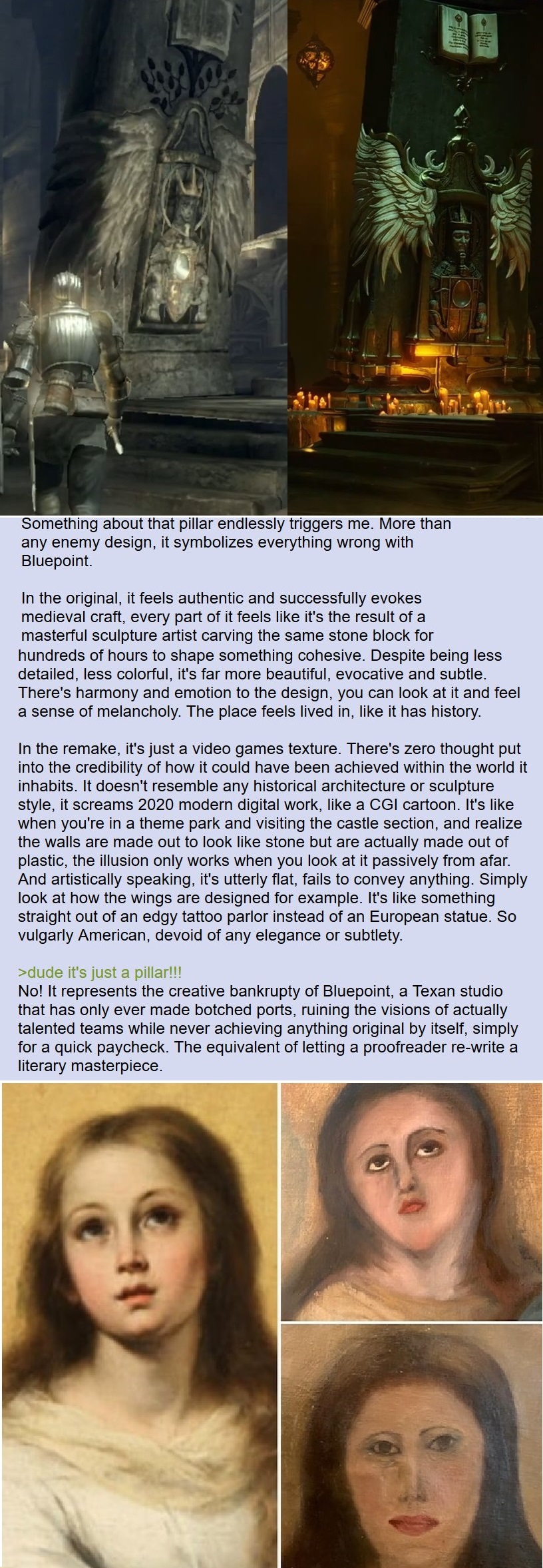>>9795589 Там вообще не в уродстве дело, пчел. В оригинале архитектура ровнялась на нечто английско-норманское, классическую готику. В ремейке это гибрид из дорогой архитектуры Нового времени и откровенной ММО-южнокорейщины (конкретно крылья на скульптуре - это именно пиздоглазый дизайн ангельских крыльев, привет Линейдж 2 и Айон). Это совершенно разные настроения, совершенно разные стили.