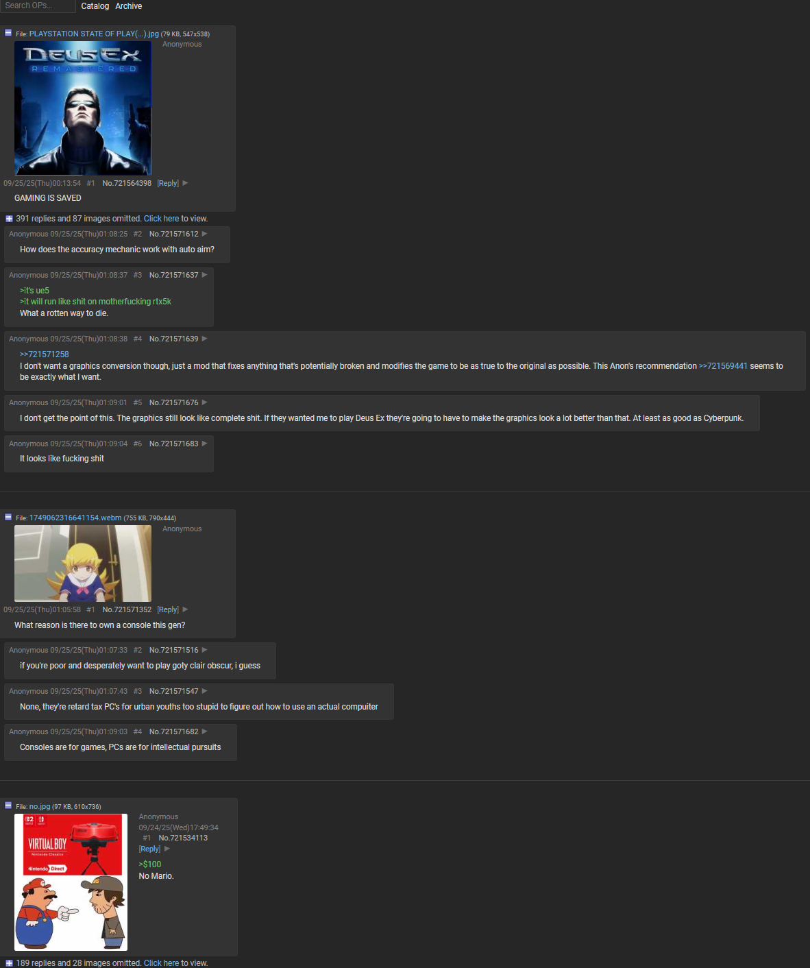 >>9810840 Щелкнул 0ую просто. Конкретно анимешных жоп с GEIMIN HILING и WHAT'S HER PLAN не оказалось, но уровень платиновости вбросов (равно как и ответов к ним) абсолютно такой же. Даже наш (?) уриношиз на месте в треде про gaming is healing saved. Дальше - классический консолесрач и столь же типичный срач про цены. Это и есть те божественные дискуссии, от которых я должен охуеть? Разве что от того, что там люди даже писать больше десяти слов разучились. Да, блять, у меня на Реддите по играм куда более обстоятельные обсуждения, несмотря на все очевидные недостатки Реддита и реддиторов. Форчепомойка - это просто дно, гроб, кладбище и пидор сразу. Финальная стадия разложения борд. Я понимаю, что ты бугурт откатал по старой памяти, наверное, потому что еще лет 8 назад форчевэ был неплох. Но где вы были 8 лет?