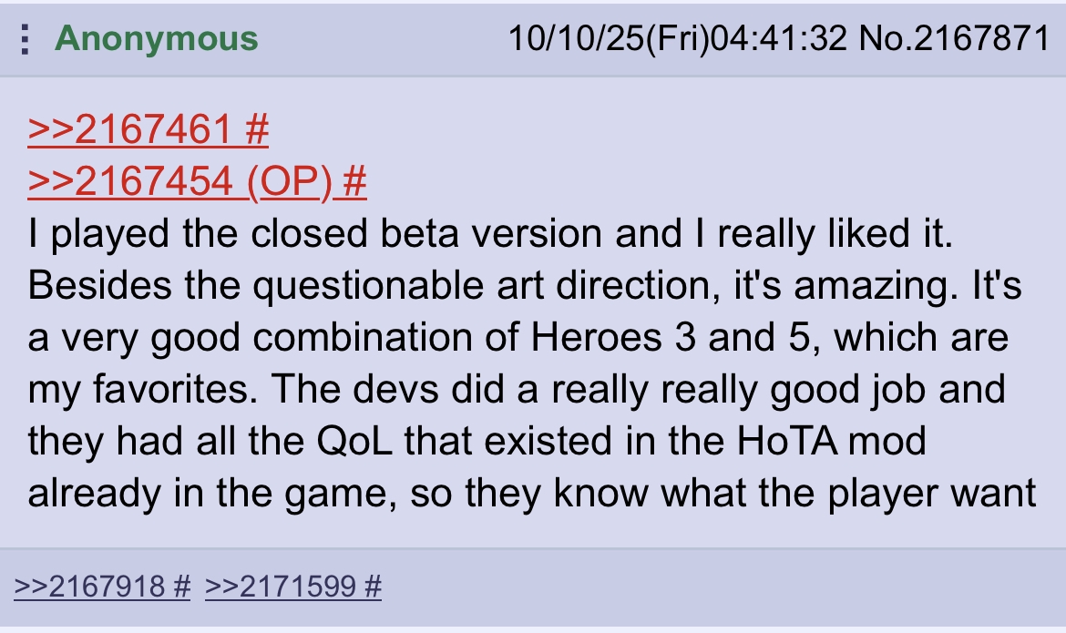 Долбоебы никак не могут перестать рисовать мобильно детский кал и нанять нормального художника, чтобы он им нарисовал классическое фентези в слегка гримдарковом стиле все это закинуть в качественное 3д, скопировав геймплей тройки и вы получите новую часть героев в которую перейдет все коммунити.