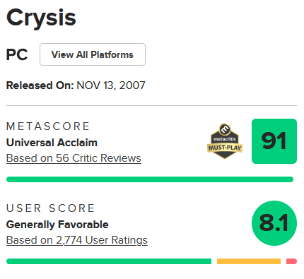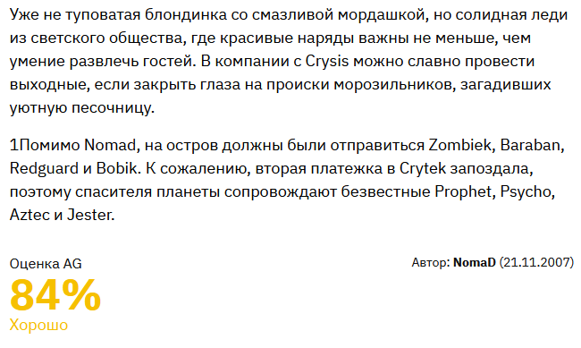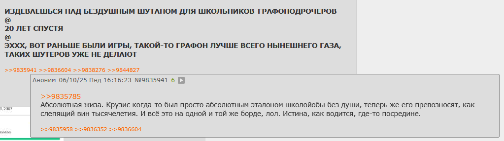 Абсолютная жиза. Крузис когда-то был просто абсолютным эталоном школойобы без души, теперь же его превозносят, как слепящий вин тысячелетия. И всё это на одной и той же борде, лол. Истина, как водится, где-то посредине.