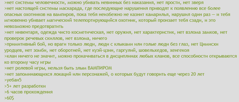 Я вот чем больше про WoD узнаю, тем больше кажется, что сеттинг Маскарада нихуя не подходит для компьютерной игры, будь-то экшон или рпг. С одной стороны, сила вампира имеет четкую связь с поколением и возрастом. И в итоге ГГ сделай птенцом - будет слишком слабым, старым - слишком сильным, чем-то средним - для одних слишком сильным, для других - слишком слабым, изъебнись как во втором Бладлайнсе с меткой - ряяя, че это вообще за хуета. С другой стороны - Маскарад и иерархия в Комарилье, которые слишком сильно все ограничивают, а выйди за рамки - неправдаподобно в рамках сеттинга.