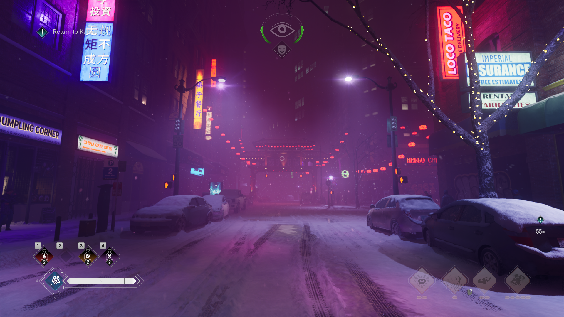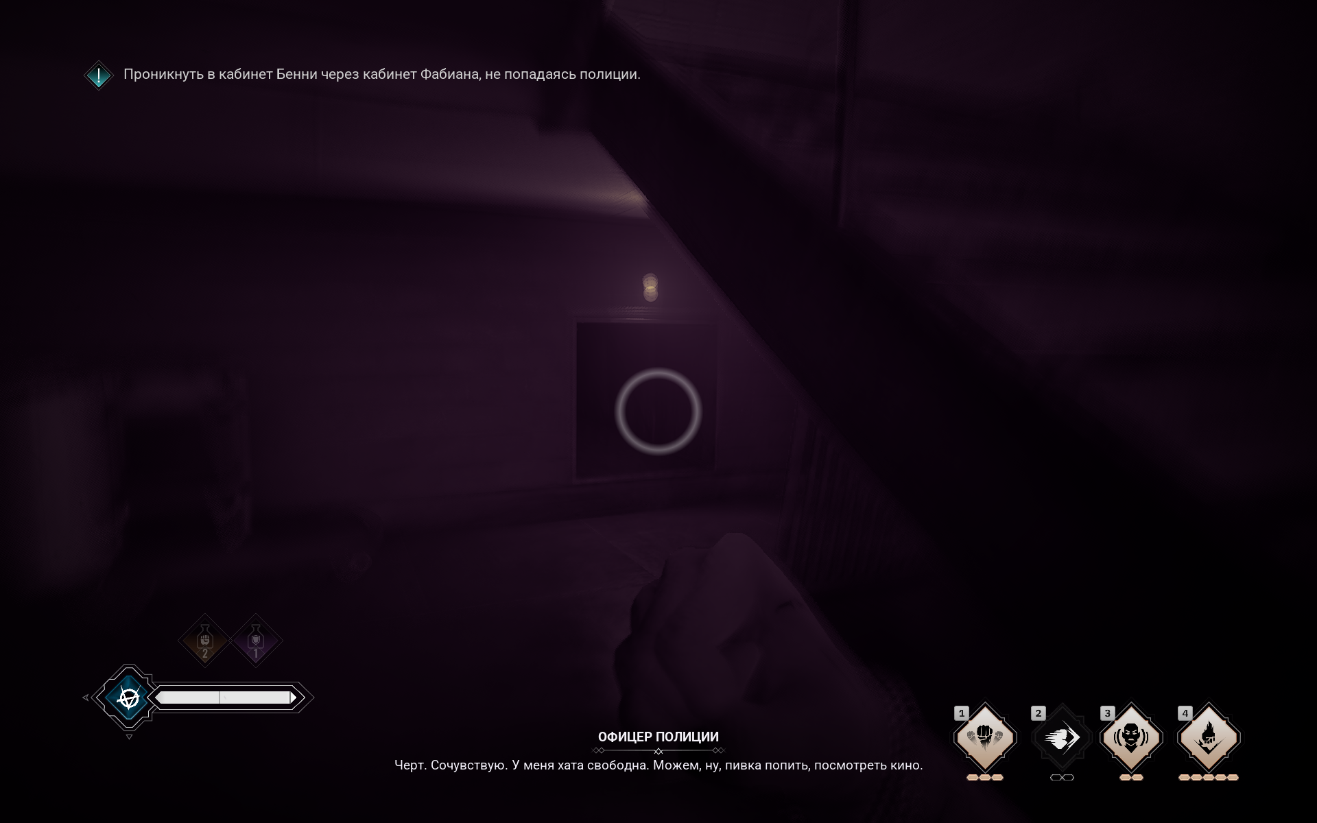 Сам город визуально хорош, атмосфера на месте, но предельно пустой. Он вообще ничем не наполнен, в нем нечем заниматься. Есть 5 основных точек, где сидят главные нпс, куда ты будешь возвращаться снова и снова - и за основного персонажа в реальном времени и в воспоминаниях за детектива. Тотальный реюз - выжимают все возможное из этих нескольких локаций, потому что помимо них здесь нихуя нет. Вот буквально 0 зданий куда можно зайти, 0 опциональных персонажей или случайных встреч. Тупо 5 зданий и улицы, наполненные болвачиками. Пока бежишь от одного задания к другому ты не можешь ничего встретить. Даже любители юбивысеров останутся недовольны, так как здесь нечего чистить вилкой. Вне квестов здесь пачка врагов на одной из крыш и еще одна где-то в переулке. А, ну есть ебанутейший гринд "правильного" типа крови ради прокачки скиллов, но этим даже самые пизданутые юбискоты не станут заниматься. Помимо этого мир абсолютно пуст. Я не знаю зачем этой игре опенворлд. Разрабы словно поняли, что заставлять перемещаться по этим улицам на обычной скорости будет слишком бесчеловечно, поэтому второму персонажу дали пассивку, ускоряющую время в 5 раз. За детектива ты ходишь от точке А к точке Б и слушаешь диалоги. Есть какая-то невнятная механика манипуляции собеседника путем применения скиллов, но они, во-первых, всегда обязательны, а не являются одним из вариантов прохождения, во-вторых, мы ничего не качаем и не выбираем, а всего лишь тыкаем то, что просит игра. Если выбрал неправильный диалог - похуй, кастуешь по новой, последствий никаких.