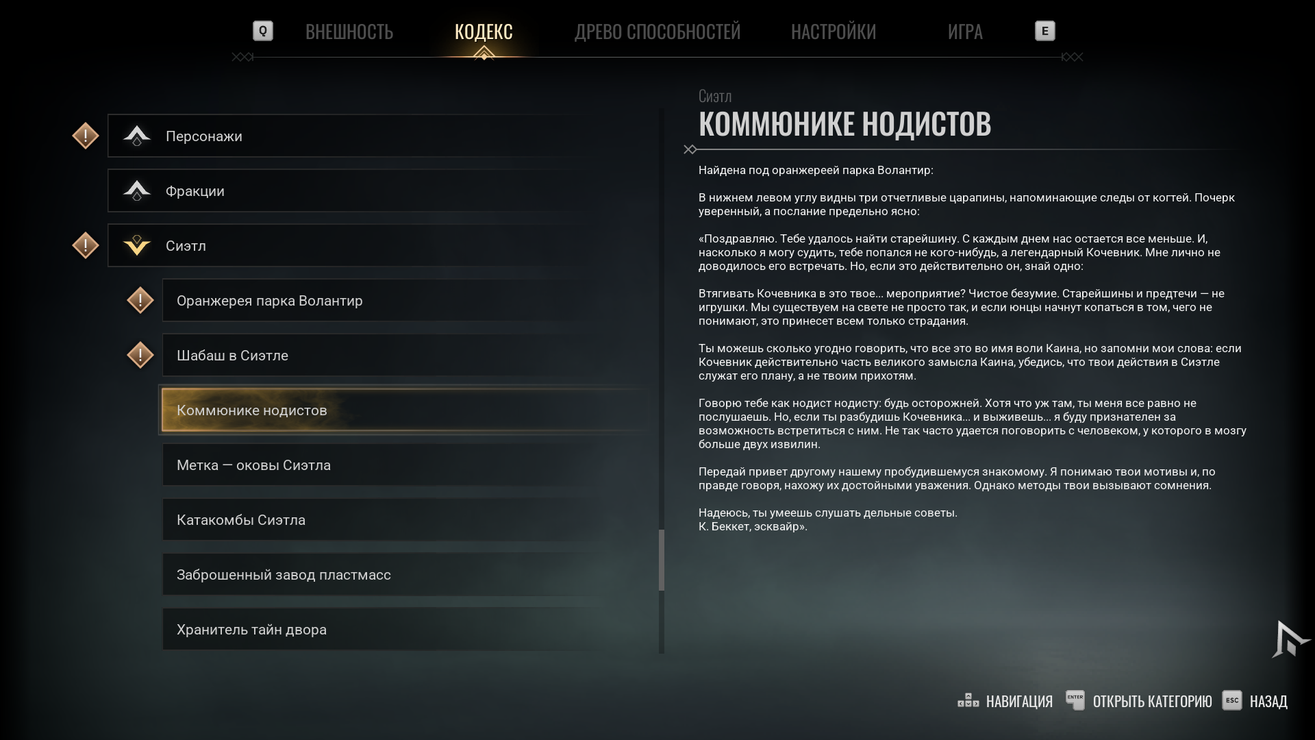 Последний квест подай-принеси у бабки понравился, такая-то Пратчеттовская атмосфера Приносишь посылку, тебя встречает типа панк, говорит, о, Кочевник, крутой отжег в Каире двести лет назад, кста. Закрывает за собой дверь и дверь исчезает, оставляя кирпичную стену. На расспросы бабка отвечает, мол, не пытайся понять, а лучше честно скажи, поддержишь меня в качестве принца Сиэтла?