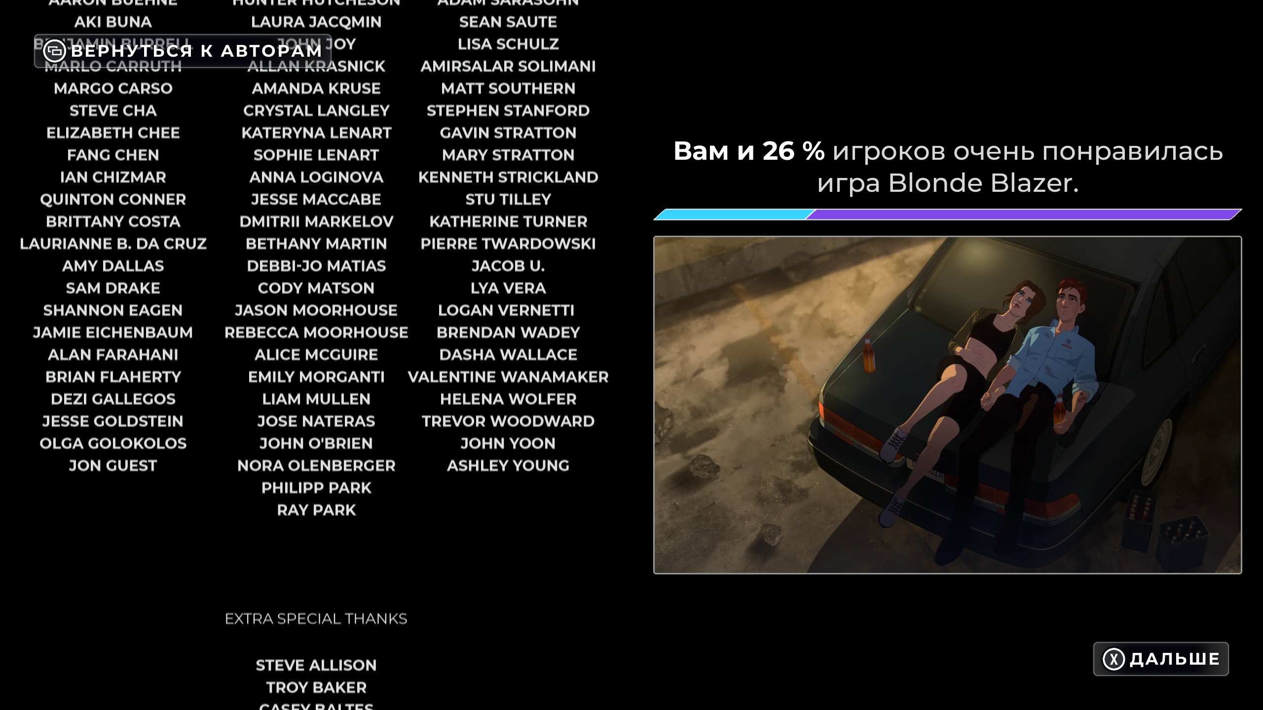 Короче я так мозгами пораскинул, и сейчас, ретроспективно, имея на руках все серии, считаю что КАНОНИЧНЫЙ рут, это в первой половине игры подкатывать к блонде, но при этом чувствовать что чот не клеится, а во второй половине перейти на Инвизидиву. Тогда складывается наиболее полная картина какая-то помоему. ТО есть идёте на свиданку к Блейзер, и там узнаёте про её амулет, но НЕ целуете её там, чтобы не триггерить отношач полноценный. В следующей серии отшиваете её в переодевалке, и всё, дальше фулл романс Невидивы. Потому что я пошёл как бы по схожему руту, но я Блондинку дропнул из своих мечтаний сразу в конце второй серии, когда у неё бойфренд объявился. В итоге в четвёртой серии ходил на свиданку в кино с невидивой, и не видел сцены где блондинка амулет снимает, и из-за этого один из финальных твистов, когда блондинка отдаёт свой амулет старику, выглядит как рояль в кустах, и очень натянутый, и никто дальше не объясняет ничего. А вот если ходил на свиданку с ней то сразу всё понятно что случилось и объяснений не нужно. Ну а в остальном всё понятно, Невидива каноничный романс очевидно, очень хорошо ложится на основной сюжет