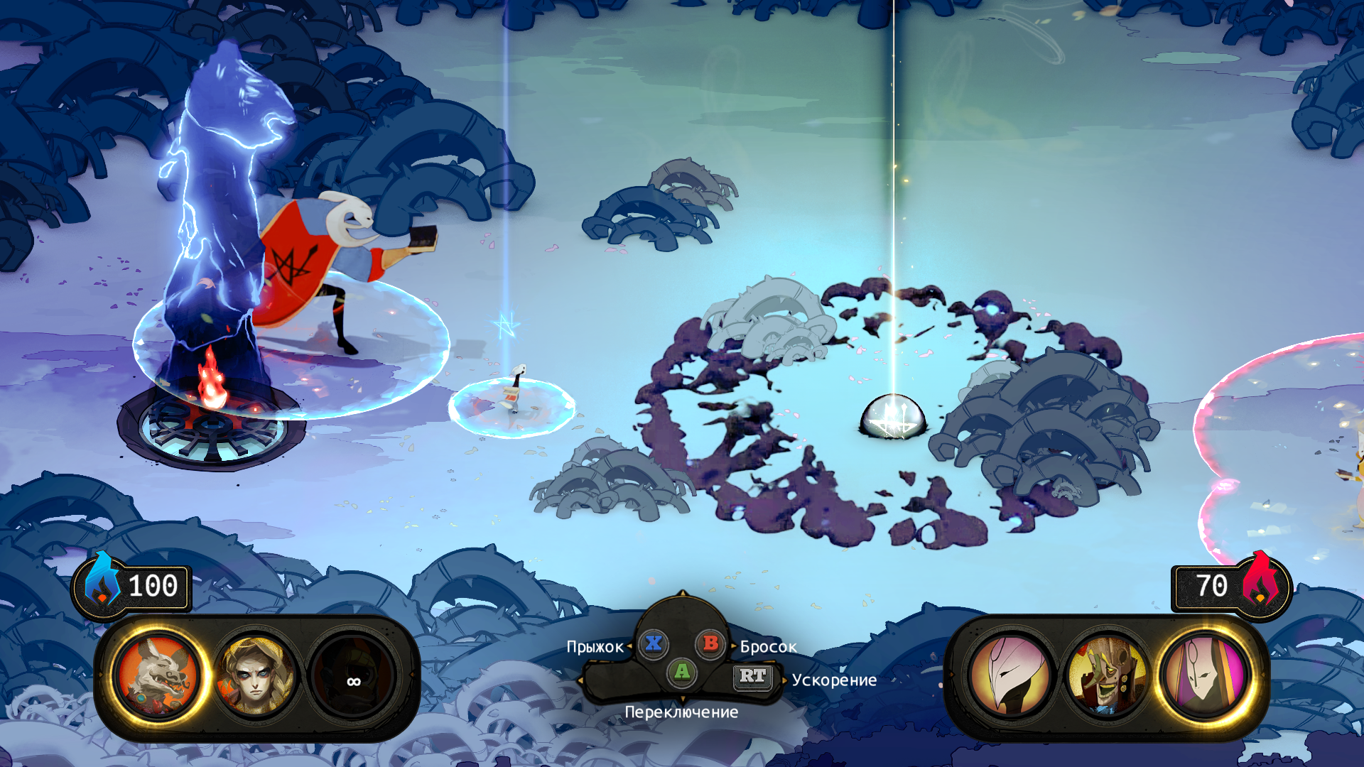 Что это Supergiant видно сразу - рисовка в оригинальном стиле хороша, озвучка - просто песня. И песни кстати тут есть, немного как по мне заунывные, но в целом в вайбы игры это вписывается. Местный мир приятно исследовать, тебя не сильно душат лором, но при желании его можно легко найти и выяснить че там как. Сюжет это традиционная уже для разрабов притча о силе духа, милосердии и борьбе за все хорошее против всего плохого. Если вникать в детали, то есть риск найти типичный миллениальский БУНД! против злой системы. Если не вникать в детали - норм.