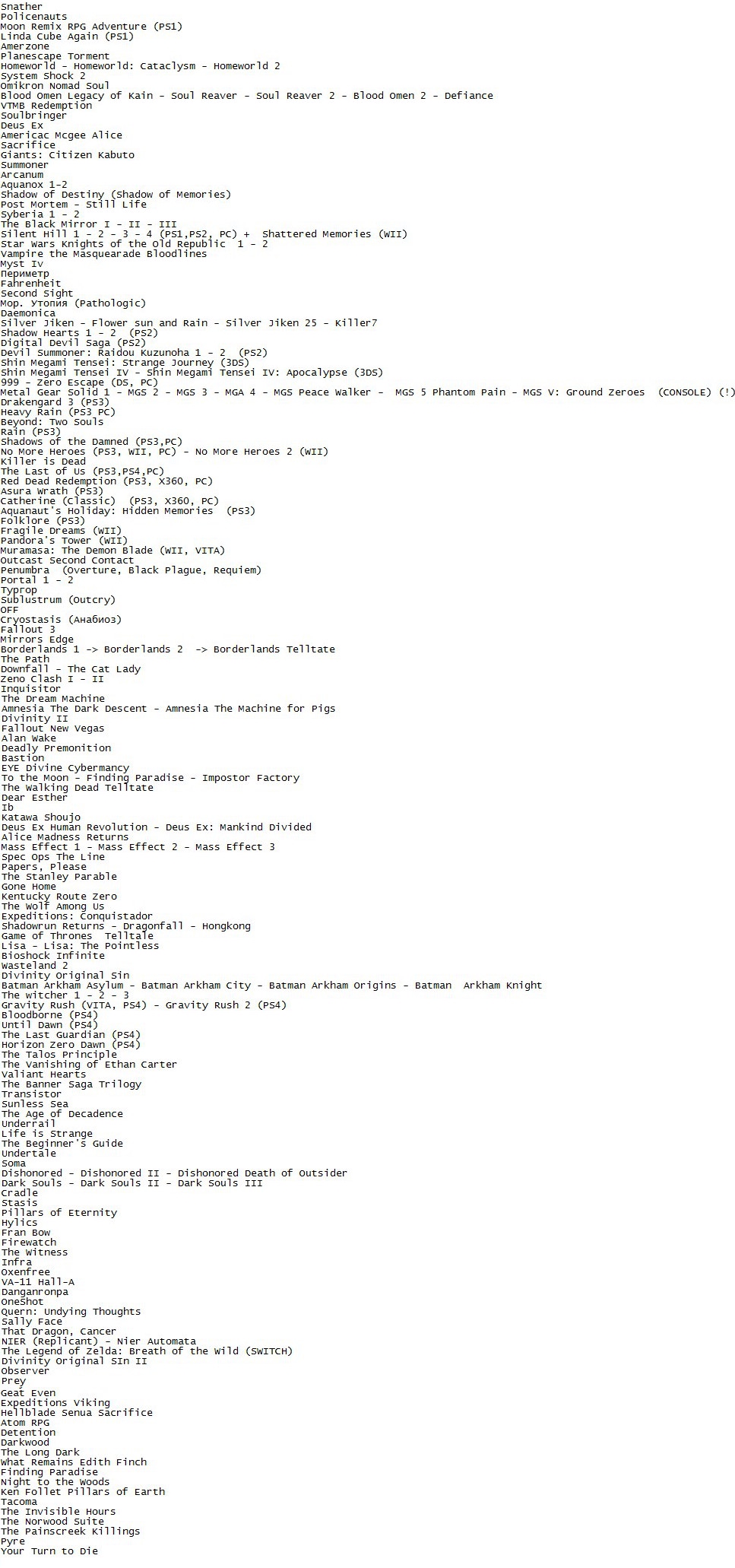 Я как-то хотел чисто для себя сделать список по аналогии history of pc gaming, только планировал добавлять туда наиболее сюжетно-орентированные, атмосферные и культовые игры, хидденгемы, а так же консольные эксклюзивы начиная с 1998 (год, когда игры полностью перешли в 3D формат и перестали поддерживать DOS), в качестве базы для составления листа использовал рутрекер, видео с канала Virtual Gaming Library, метакритик и backloggd. Но на 2017 году конкретно так сломался, видеоигры стали расти в геометрической прогрессии, перечень интересных проектов превысил отметку в 600 и продолжал увеличиваться с невероятной скоростью и это не говоря о скрытых алмазах с itch io. Сейчас чувствую себя немного разбитым. Попробовал максимально отфильтровать базу данных удалив все лишнее и все равно получил больше 150 шедевров которые нужно пройти/перепройти перед тем как умереть.