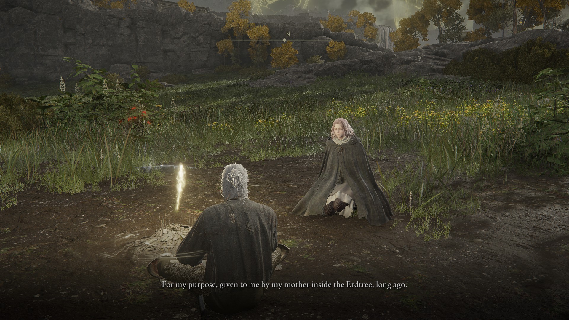 >Secret incantation of Queen Marika. Only the kindness of gold, without Order. Creates a small, illusory Erdtree that continuously restores the HP of nearby allies. Marika bathed the village of her home in gold, knowing full well that there was no one to heal.