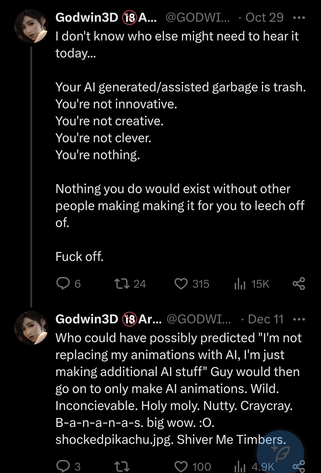 >>9989412 И снова заговор. Нейроговно не покупают из-за заговора платформ и уничижительного тега "ai", а теперь еще и студии анимации в сговоре чтобы задушить перспективную технологию. Повсюду луддиты..