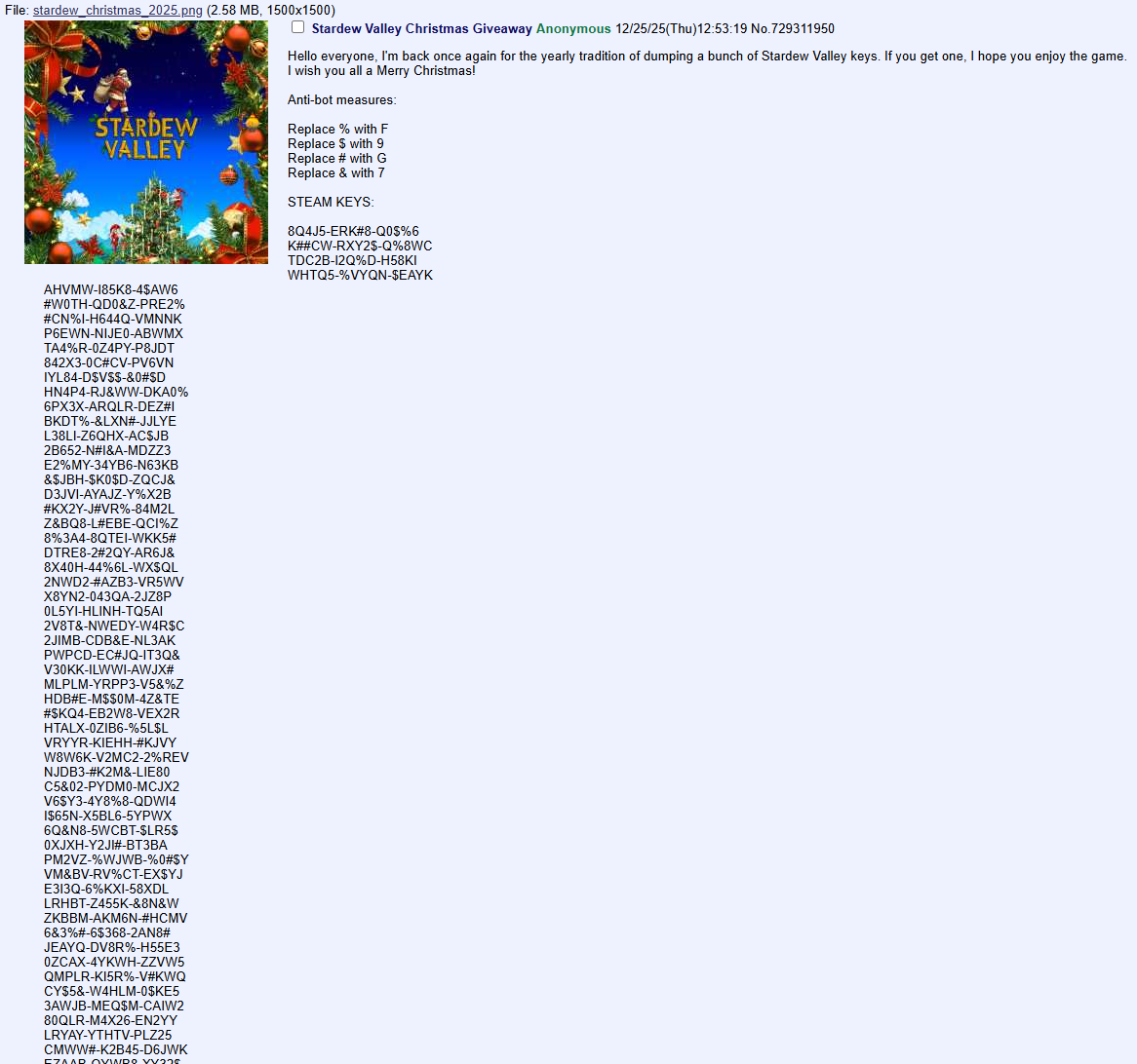 >>10010671 (OP) На форчке на Рождество традиционно раздают пачки ключей Stardew Valley даже успел залутать в этот раз А на мочепедальном подтираче кто-нибудь что-нибудь раздает кроме хуя без соли? За исключением Глиномесыча