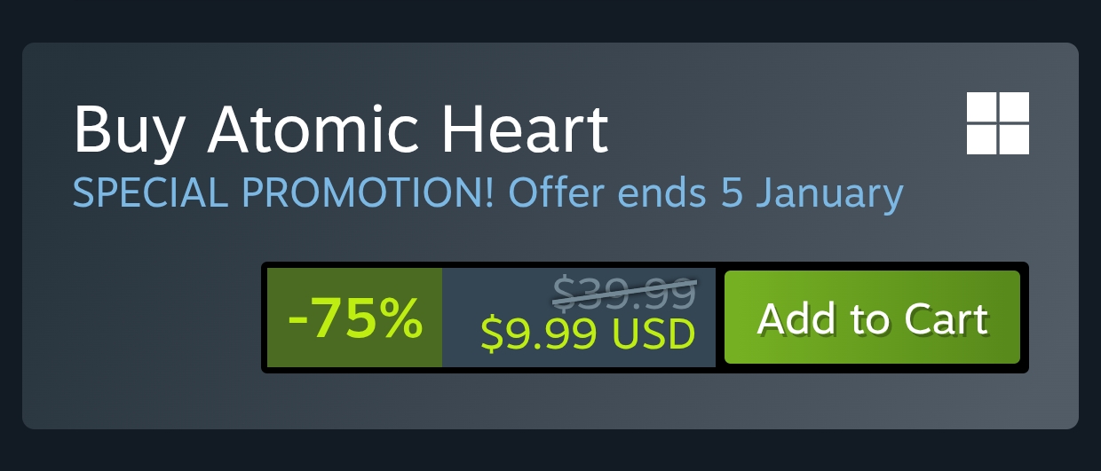 >>10032969 >Следующая большая распродажа будет весной Обычно зимняя самая жирная, проще брать на что скидка 90%, потому что 95% уже редко вывает и не факт, что на следующей распродаже будет 90