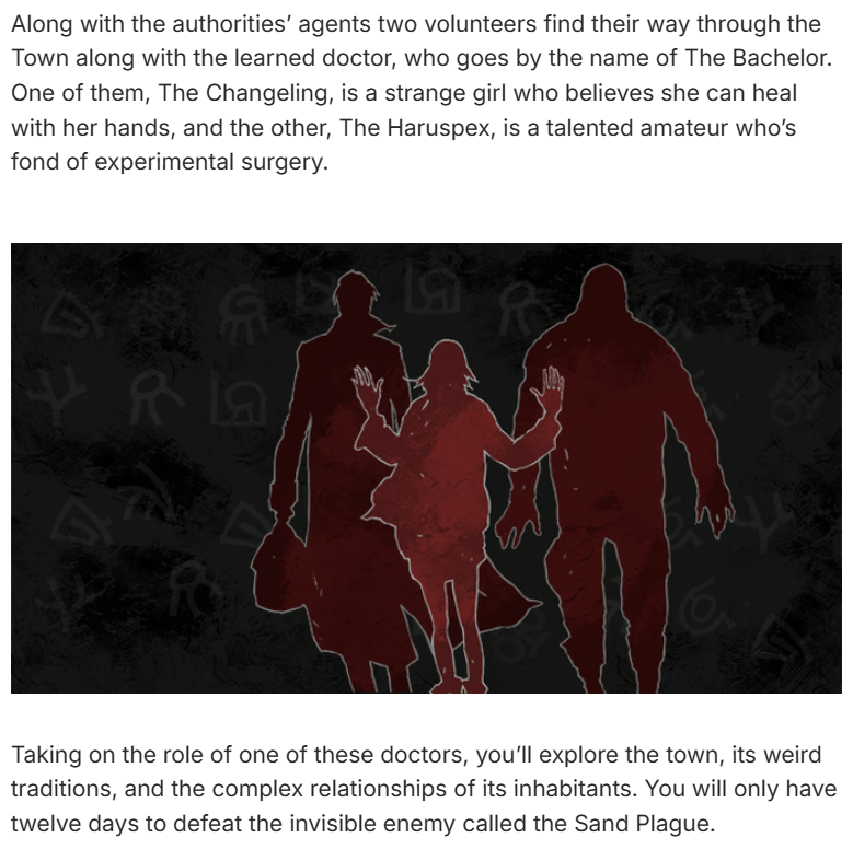 >>10047480 В оригинале 3 компании, за 3 персонажей - Бакалавр (ученый), Гаруспик (местный хирург-знахарь народный) и Самозванка (чудо-девочка) У каждого персонажа свои особенности геймплея и механики, свой набор квестов и диалогов, свой набор приближенных (людей, с кем плотно общаешься и кого важнее спасти). Но все они так или иначе являются симулятором бомжа.