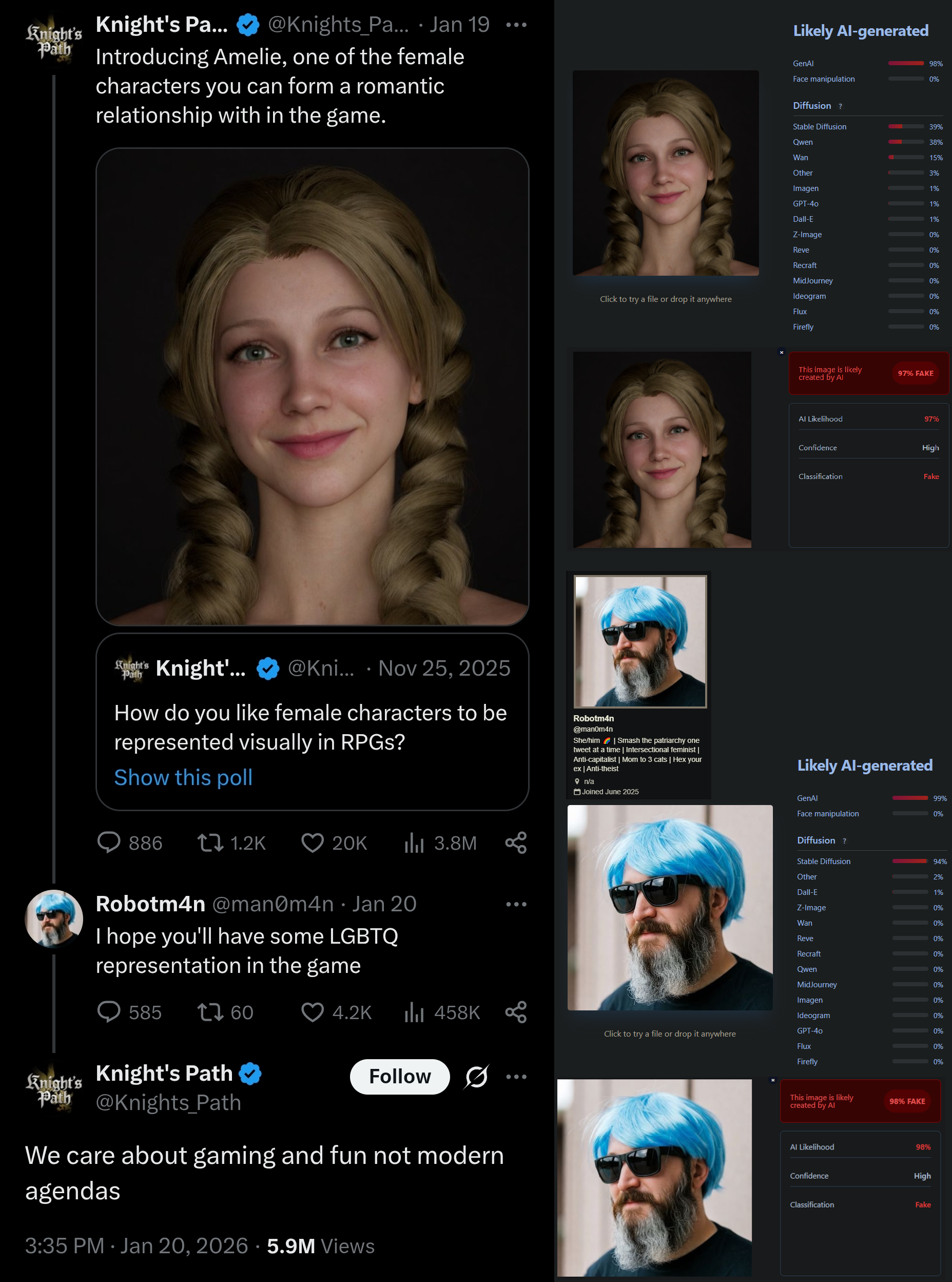 На твиторе после того как разрабы игрушки Knight's Path показали милую тяночку, типа спутница для романса, блеваки потребовали и лгбт романов Разрабы ответили нет и начался сущий кошмар