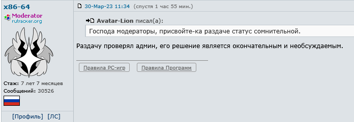 >>10084669 > Порешали бы на рутрекере, чтобы была 1 раздача - 1 игра в виде portable версии Скажу тебе так, твоя затея - полная параша. Вдруг мне нужна не portable, а сцен-релиз для каких-то задач? Тем более, не стоит забывать, что большая часть раздач игр в Portable версиях - весят много, и не каждый может их установить и оставить на потом, большинство людей после прохождения той или иной игры, их удаляет. >причем раздача как бы от самого рутрекера >во вторых было бы больше доверия У рутрекера есть похожий аккаунт для раздач, он называется "intellect", но он для забытых и удаленных аккаунтов, если мне не изменяет память. Кроме этого, иногда сами модераторы и VIP'ы периодически создают ту или иную раздачу, как и некоторая часть из админов, так что.. В этом теряется смысл. Ну и "доверие" - штука такая.. Сам пойми, человек может заслужить доверие, а потом спустя несколько месяцев начать лить говняк. Будешь ли ты после этого ему доверять? Конечно нет. (достаточно вспомнить Seyter/qoob, как он заливал несколько лет нормальные репаки, а потом в одно время начал заливать игры с майнером) >в третьих репаки уже такая себе тема В различных местах где очень плохо с интернетом, репаки ещё очень нормальная и живая тема, и люди их скачивают, и к сожалению не каждый может себе позволить скачать 60-100+ГБ игры, и вместо этого люди скачивают "репак бу ВАСЯ1337" с весом в 25-45+ГБ. >Можно было бы еще сделать как бы один единый архив со всеми торрентами игрулек По правилам рутрекера, ЕМНИП, запрещено раздавать архивы. (Но там есть какие-то исключения, какие точно, сейчас не скажу)
