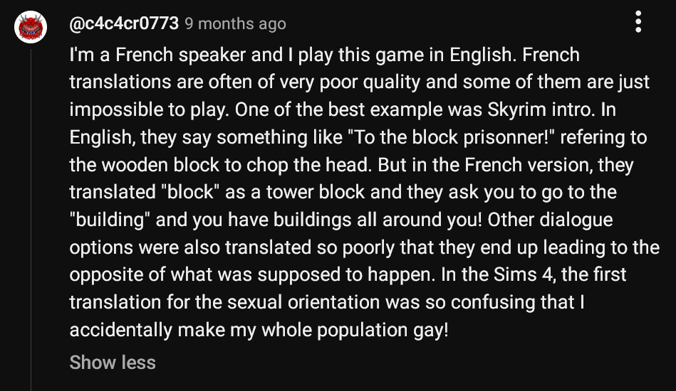 Оказалось, что игроков на английском преследую фантомные боли из нулевых годов, где приходилось ждать машинный перевод месяцами, локализацию годами, и локализация была у единичных продуктов. Они считают, что до сих пор существует такая практика и не подозревают что русская локализация выходит в день релиза, зачастую с локализации с оригинального, а не английского языка. Давно уже нет местных студий локализаций, которые уже после выхода игры отдельно договариваются для локализации игры.