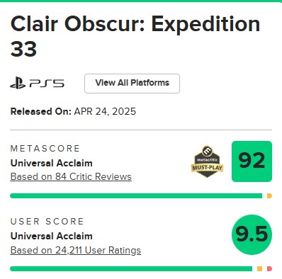 Министерство культуры Франции присвоило разработчикам Clair Obscur: Expedition 33 звание кавалеров Ордена искусств и литературы в знак признания их выдающегося вклада в искусство, литературу и культуру посредством игры. По мнению министерства, Clair Obscur: Expedition 33 доказывает, что видеоигры — это искусство. Причём французская RPG смогла выделиться благодаря своему масштабу, а также поддержке со стороны критиков и простых игроков. Отдельно отмечено то, что игровая индустрия стала важной экономической отраслью.