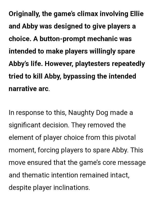 нахуя у игроков забрали выбор в концовке? чтобы что? вы и так заставили силой проникаться этой ебучей эбби пол игры, ещё и насильно заставляете игрока делать ПРАВИЛЬНЫЙ (по мнению жидогигачада) выбор. пиздатому постановщику это вообще не должно быть проблемой для сценария, если игрок не просто в игре ножичком махает, а хочет чувствовать себя частью истории, то дайте ему сделать неправильный выбор, блять. даже в обоссаной гта 4 дали возможность прочувстовать оба сценария - убивать дарко бревича или пощадить, хотя это даже не сюжетно ориентированная игра, но через эти мелкие выборы все равно прослеживалась одна и та же тема - насколько важно отпускать прошлое.