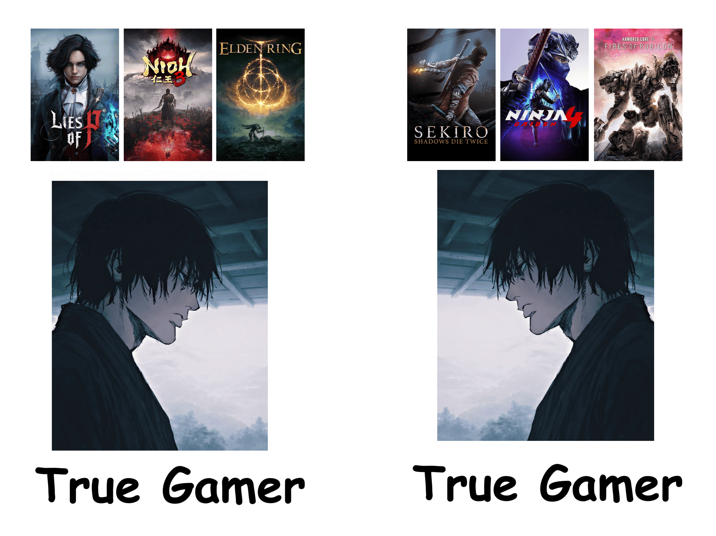 Короче, играю во все - новеллы, шутеры от 1 и 3 лица, рпг, пошаги, экшн рпг, рпг. Все кроме соулсов - вот они на 100% мне не нравятся абсолютно. По крайней мере классические соулсы и элден ринг, т.к мне не хватает там контекста в отличии от какого нибудь Секиро, например