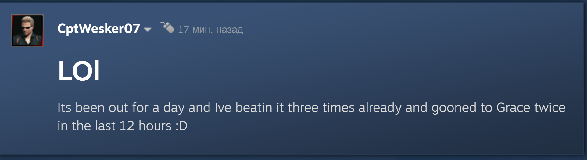 Короче первый 10 часов игры это Поместье-Духотура в духе Ремейка второго резика, где ты играешь за хнычущую Грейс, у которой нет места в инвентаре и все ебаные зомби оживают по 50 раз. Но потоооооом... мы возвращаемся в Ракун Сити за Леона и начинается геймплей 4 Резика.