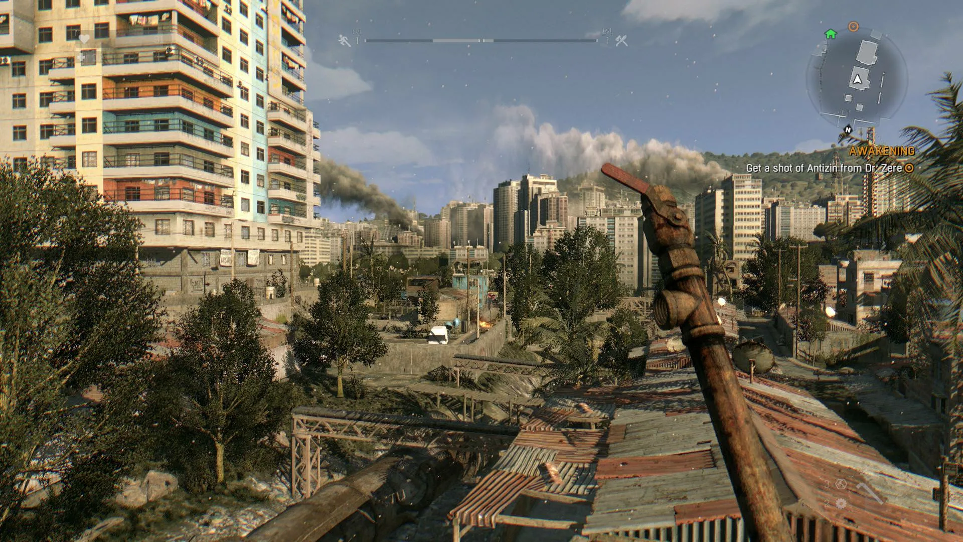 -- Атмосфера. В ДЛ сеттинг избитый, но по своему хороший. Помесь РЕ про Раккун сити+щепотка Мэд Макса. Солнце, пальмы и глубокие тени в зной, снующие зомби и ужасающий вой мертвых, пост-хаос и умирающий такой же зомби-городок Арабский. Настроение игры не такое более яркое и веселое как DI2. С ноткой меланхолии и депрессии. Дневной ужас во плоти, буквально. Ночью что уж говорить, форменный ад (хотя графически ночи хуже)