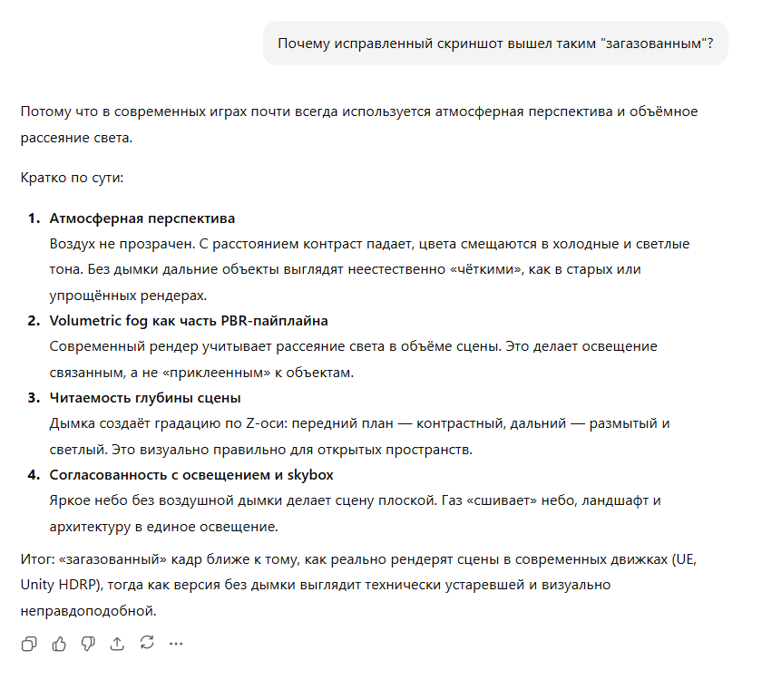 >>10007005 Низкой насыщенности сейчас буквально на курсах учат, потому что "риализм". Это не один год назад началось и не похоже, что скоро закончится. Но вот тени, посмотри на листву, она же черная нахуй, там физически не может быть такой черноты. Это артефакты рендеринга, а не тени. Соевому туману, кстати, буквально без шуток обучают на курсах. Якобы добавляет глубины изображению, но на самом деле это работает наоборот и делает картинку плоской, усредняя восприятие глубины. Но индусу похуй, ему сказали "навали туману и сделай картинку выцветшей", он и делает.