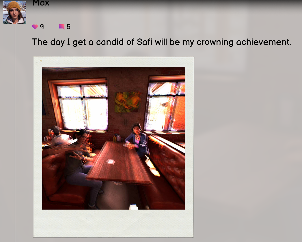 Просто представьте что у вас на руках буквально умерла подруга, а через джва дня вы уже постите смищные фоточки новой подружки. Вот эти люди, напоминаю, сделали игру где у главной героини буквальная суперспособность "эмпатия". Еще они видимо не в курсе, что полароид высерает из себя всратый глянцевый картридж, а не пост напрямую в инстаграм блядь