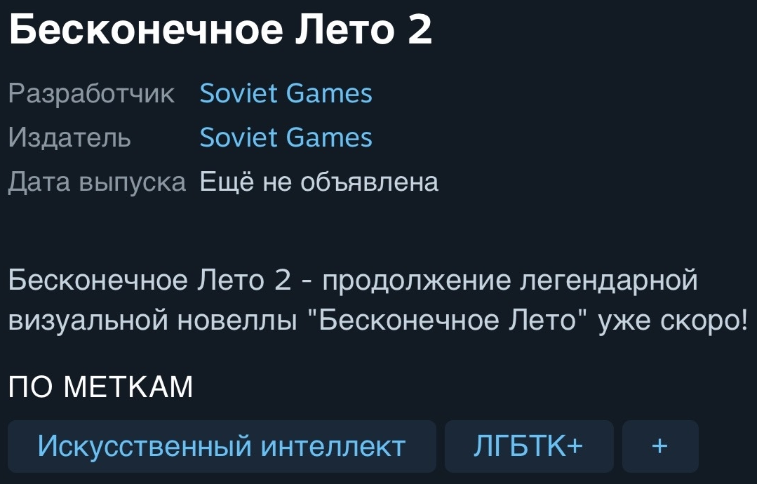 В продолжении культовой визуальной новеллы "Бесконечное лето" Семён, вернувшийся в серую реальность после загадочного лета в пионерском лагере "Совёнок", внезапно обнаруживает, что время снова играет с ним злую шутку. На этот раз он просыпается в альтернативной версии лагеря, где старые друзья изменились до неузнаваемости, а новые тайны скрываются за фасадом беззаботных каникул. Разветвлённые сюжетные линии, романтические перипетии и философские размышления о судьбе ждут игроков в "Бесконечное лето 2" — игре, где каждое решение может перевернуть вечное лето с ног на голову. Готовы ли вы снова потеряться во времени?