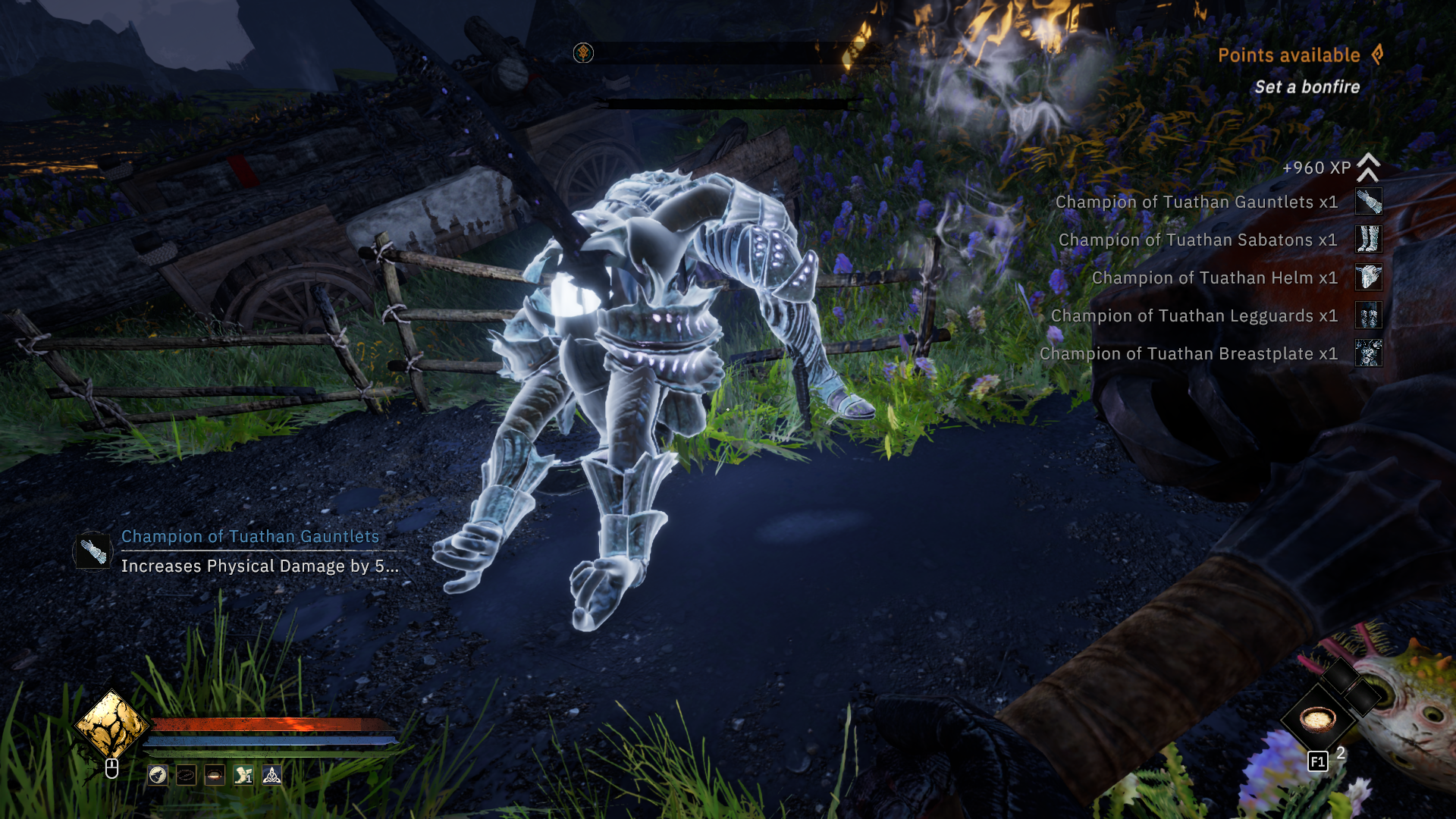 >>10052182 (OP) Во втором акте, призрак четырехрукого пидора уже не просто маячит в тумане во время ночной хуйни, а ищет тебя и нападает. Ну я и решал ему пизды вломить. Ваншотит только его йоба телепорт атака, поэтому проще всего было вокруг него кружить, уклоняясь от мили атак и пиздить молотком. Урона немного проходит, но стамина отнимается и он падает на колени, давая время еще его побонкать по голове, а это считается как weak damage. Лут так себе, но есть пара интересных вещичек типа перчаток +50% урона если хп полные. При чем нужно еще проверять шмот, влияет ли прокачка на верстаке не только на броню, но и на пассивные бонусы. У некоторых бустятся и они. А опыта дали совсем мало. За простенький квест на зачистку оставшихся лагерей бандитов дали 3300х3 опыта.