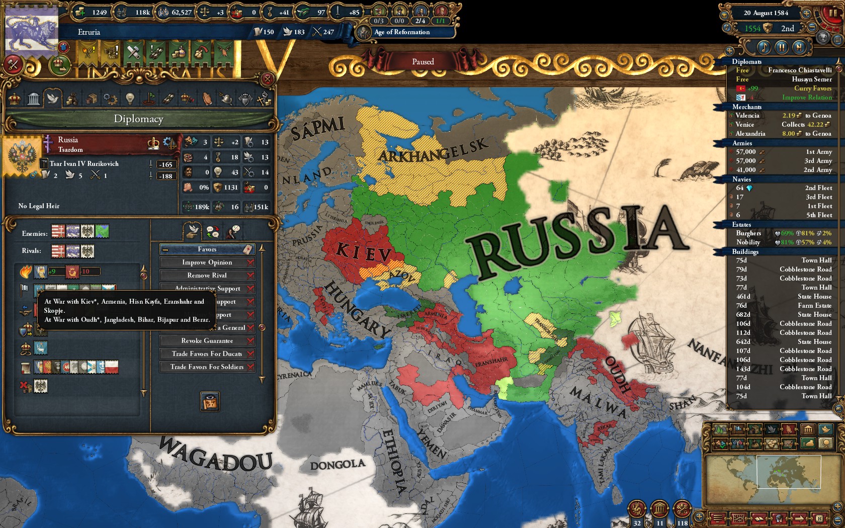 >>10055199 О, собрат по несчастью. Тоже в еу4 играю, пятёрка вообще не зашла Сижу на высокой Этрурии с догемодом (считай ванилла+). Бот на России странно играет: дорвался до Индийского океана, но при этом игнорирует земли своей культуры на севере и только сейчас взялся за уничтожение Киева