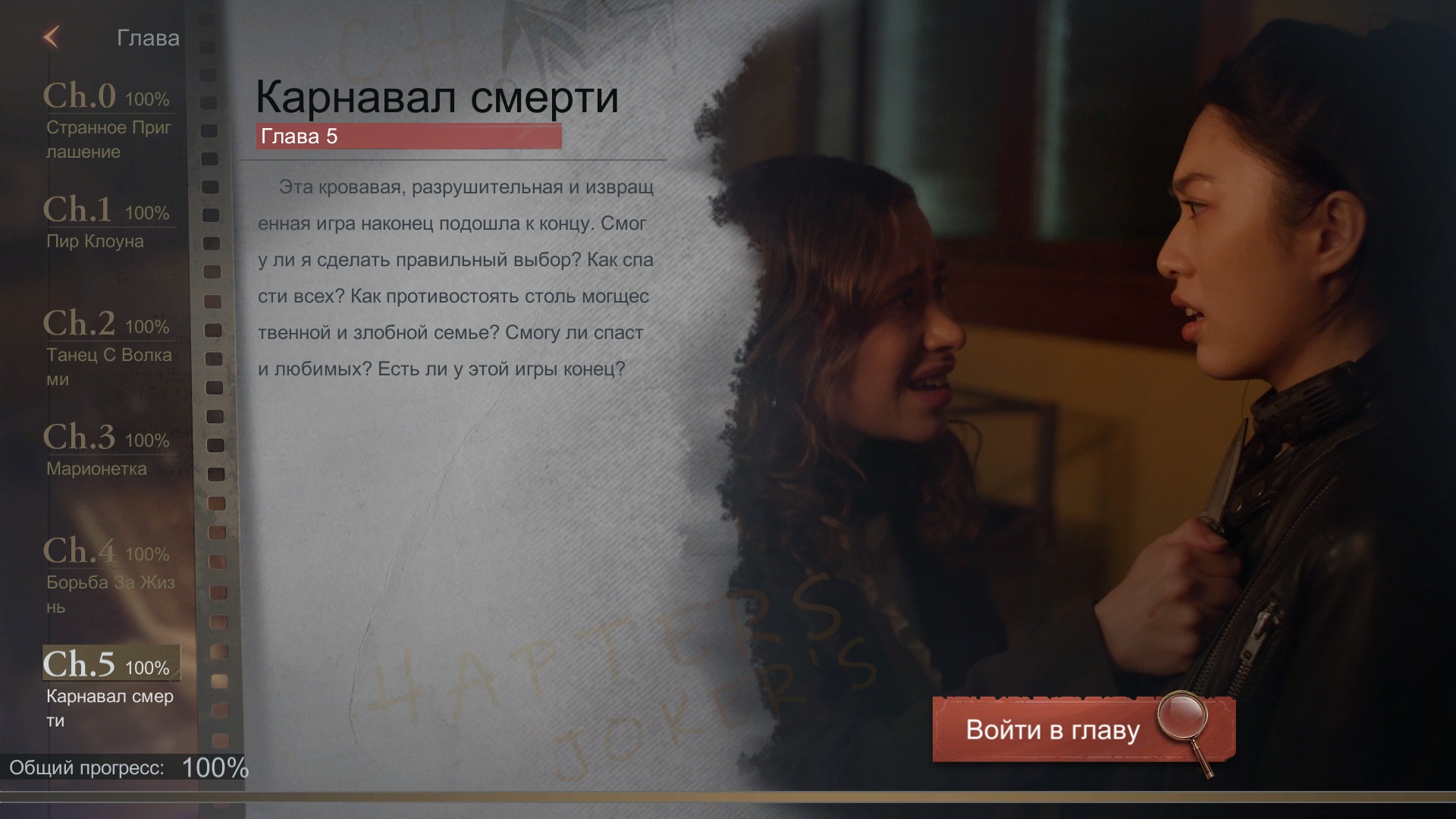 Ура, наконец-то прошёл на 100% эту замечательную игрушку! На полное прохождение ушло не более 15 часов, но это было очень увлекательно и занимательно. Редко когда игра может так увлечь, но это именно тот случай. Смело могу рекомендовать тем, кто ищет что-то новенькое и кто со скучился по играм с живыми актёрами. К огромному сожалению, в эпоху реалистичного 3Д такое выпускают совсем нечасто.