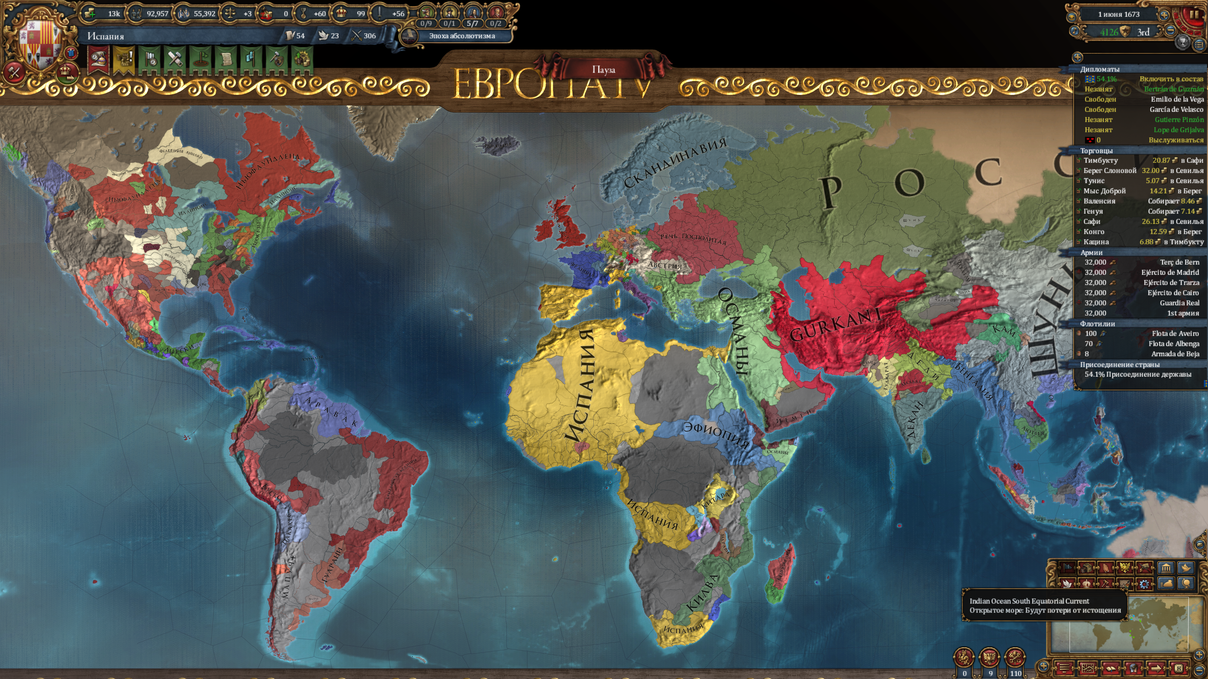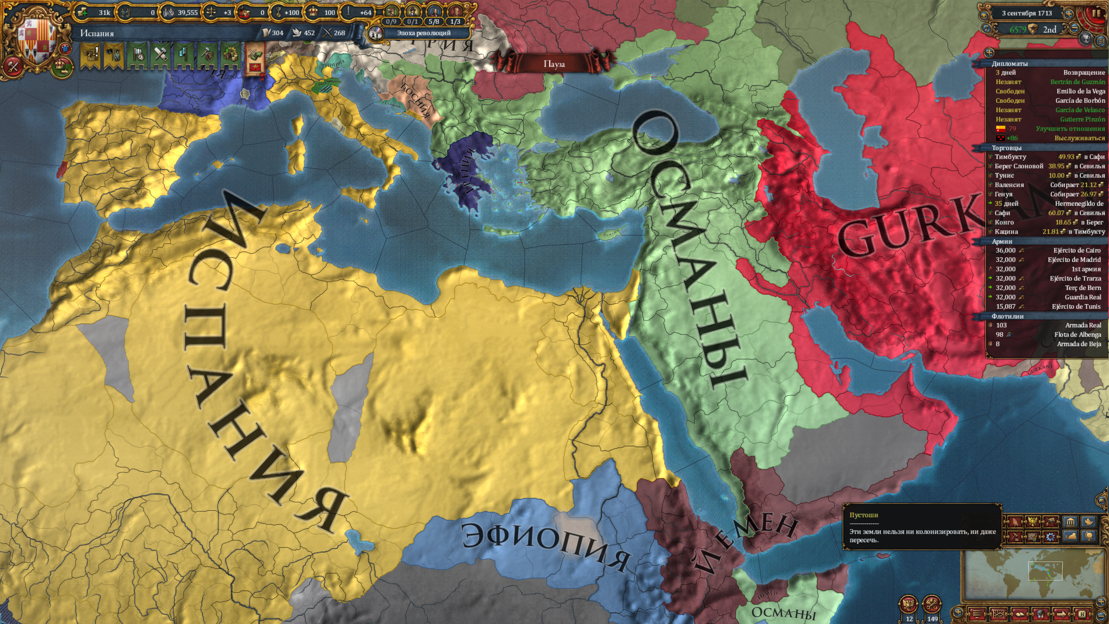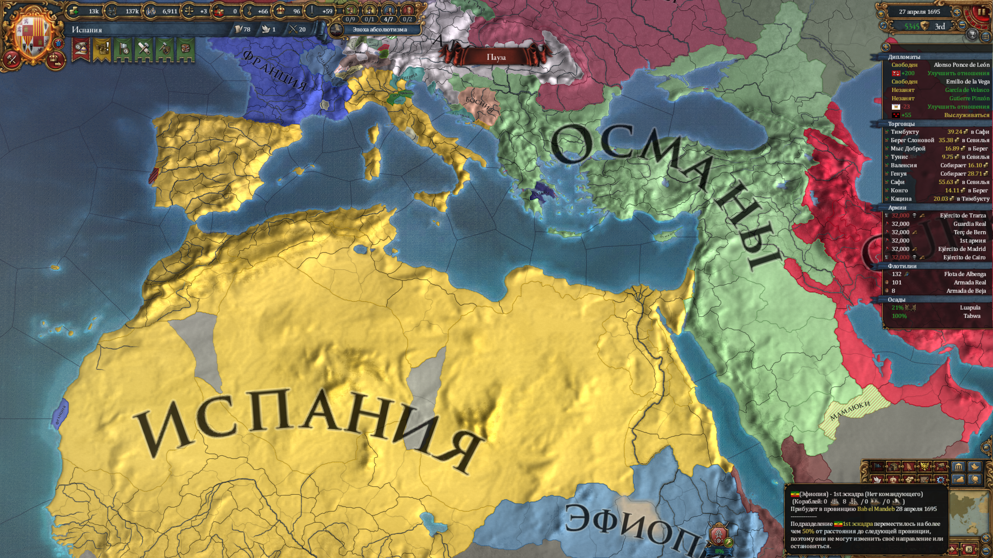 Продолжаю покрас Африки, и заселение её Кастильцами. В планах финальная война с Османом. Планирую забрать у него Египет и выделить себе пару ручных зверюшек на Балканах.