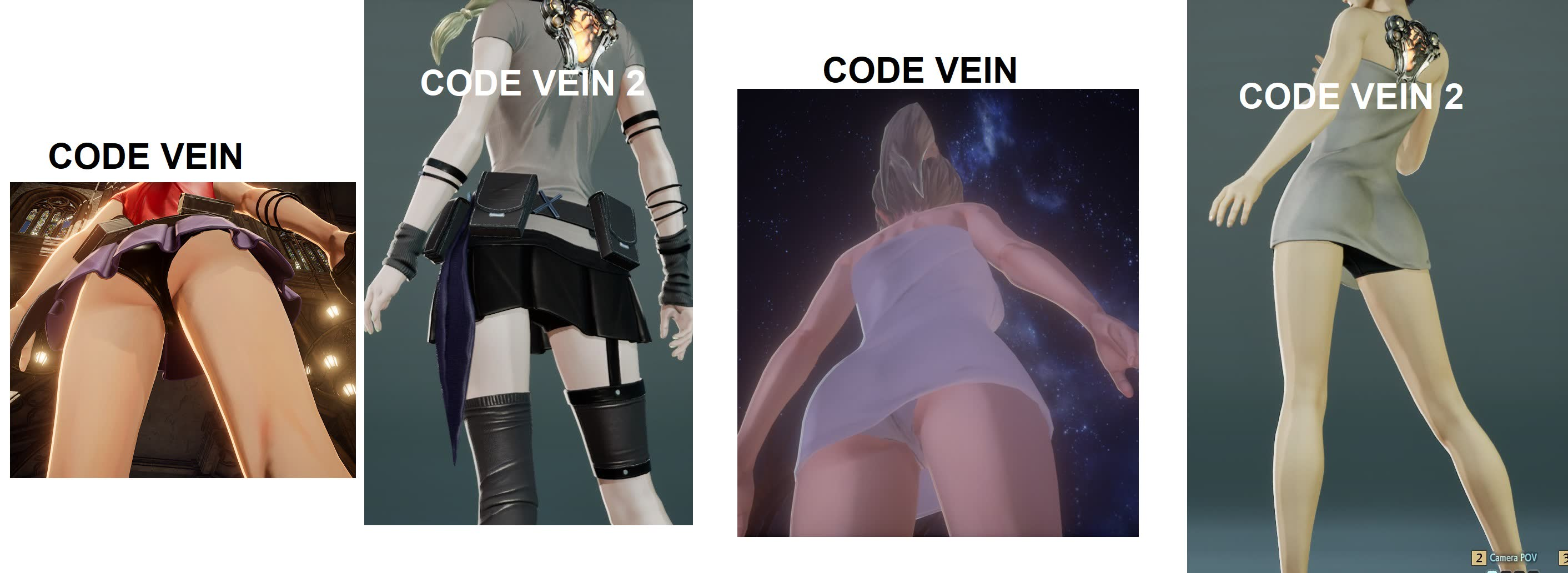 Пизда. Код Вейн знаменитый своими сиськами выглядит в сиквеле вот так. Женские наряды получили черные штаны, чтоб прикрыть ноги, а это максимальный размер сисек. Вот, что мы потеряли.