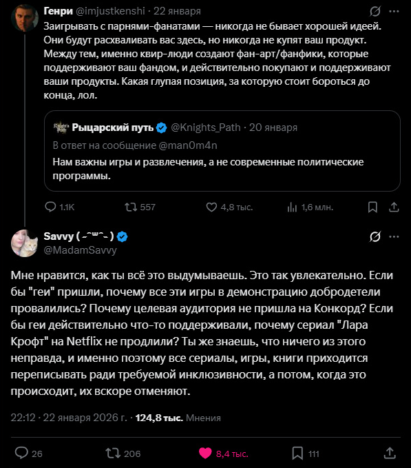 На твиторе после того как разрабы игрушки Knight's Path показали милую тяночку, типа спутница для романса, блеваки потребовали и лгбт романов Разрабы ответили нет и начался сущий кошмар