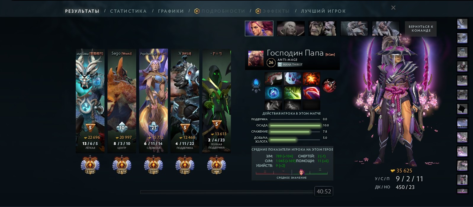 Почти на равных сыграли. В противоположной тиме рубен+рудж царили просто нереально - топовый уровень саппов как у прокотлет. Не смотрел, стак у них или нет - но скорей всего как минимум эти двое в стаке - слишком слаженно работали на карте. У нас только алхимос оказался отсосным - но он в конце матча извинился за дерьмовую игру. Не пошло - бывает. Я на аме просто пушил линии/долбил вышки и изредка подскакивал помочь.